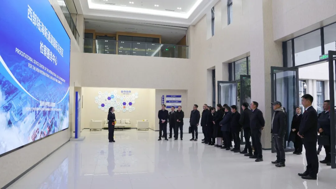 2025年12月23日至24日,重庆市沙坪坝区检察院组织开展“服务保障市场化、法治化、国际化一流营商环境建设”代表视察活动。图为全国人大代表、市人大代表参观西部陆海新通道国际法务区检察服务中心。