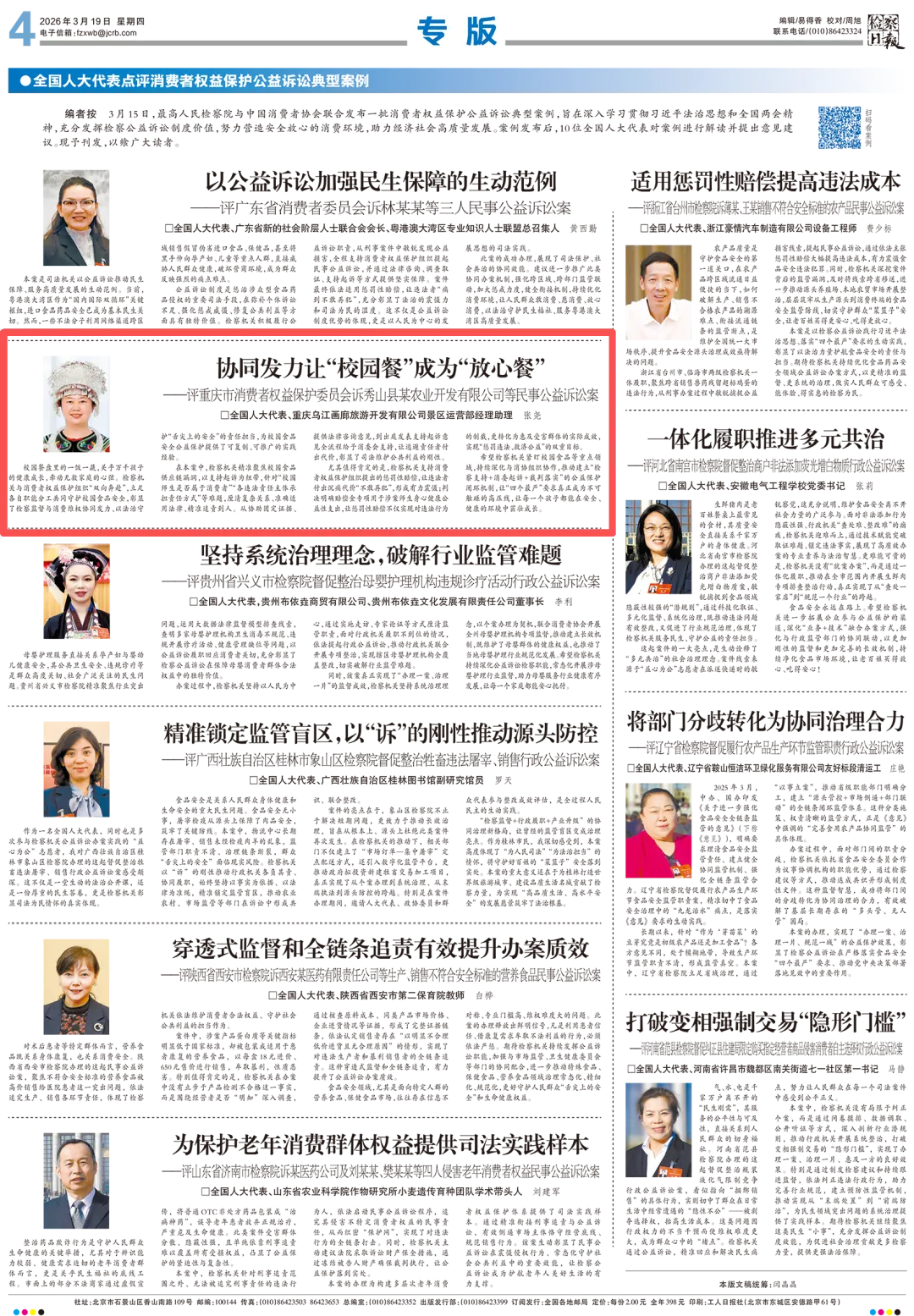 2026年3月19日,《检察日报》第4版刊登《协同发力让“校园餐”成为“放心餐”——评重庆市消费者权益保护委员会诉秀山县某农业开发有限公司等民事公益诉讼案》一文,内容如下: