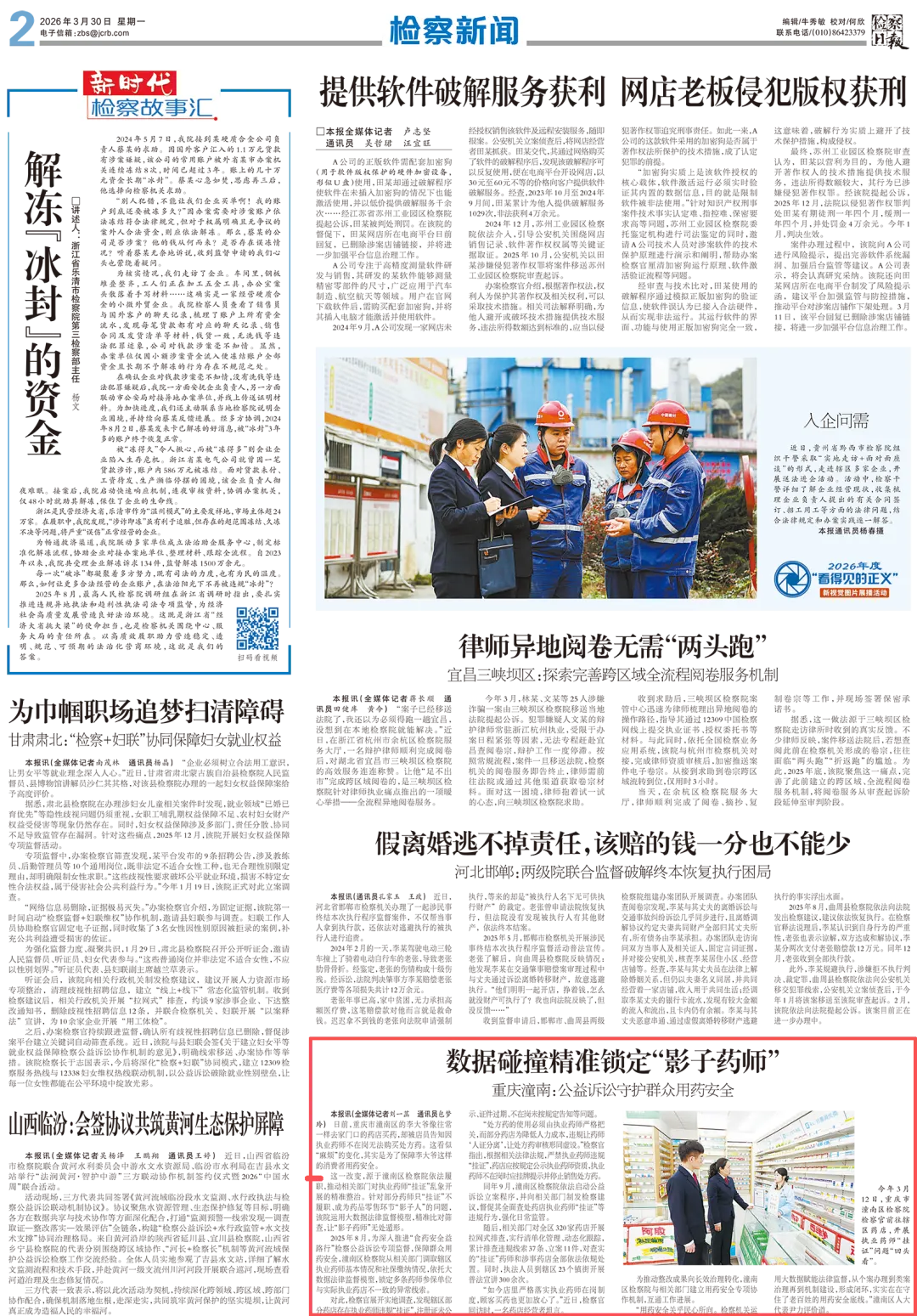 2026年3月30日,《检察日报》第2版刊登《数据碰撞精准锁定“影子药师”——重庆潼南:公益诉讼守护群众用药安全》一文,内容如下: