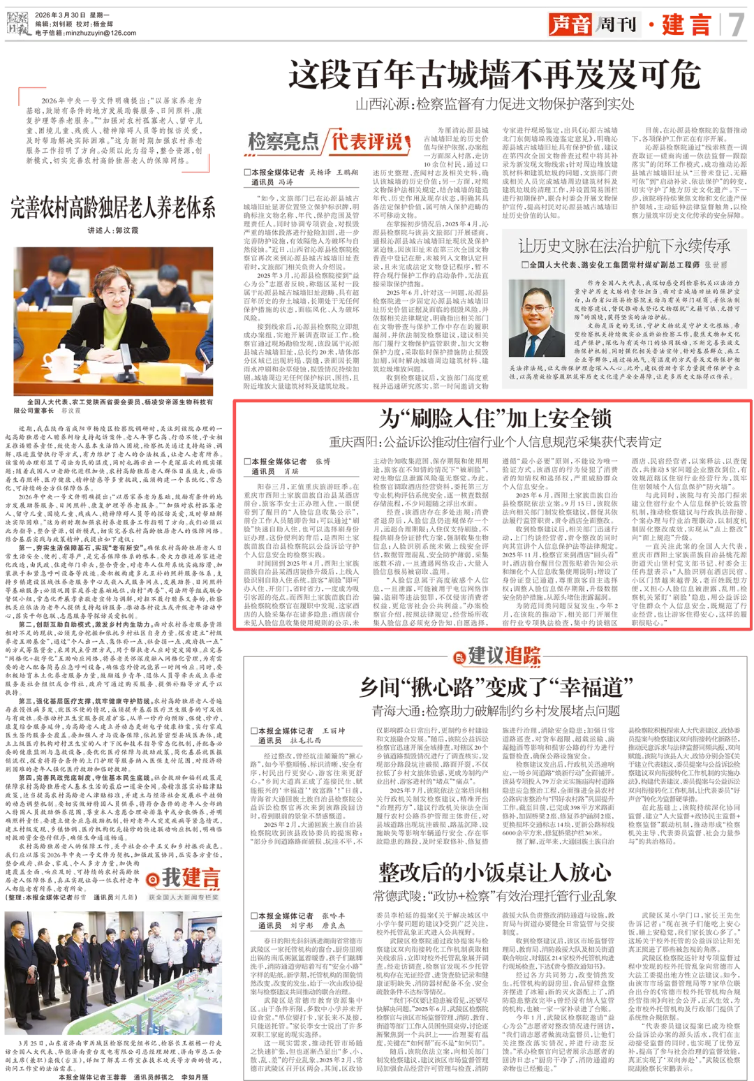 2026年3月30日,《检察日报》第7版刊登《为“刷脸入住”加上安全锁——重庆酉阳:公益诉讼推动住宿行业个人信息规范采集获代表肯定》一文,内容如下: