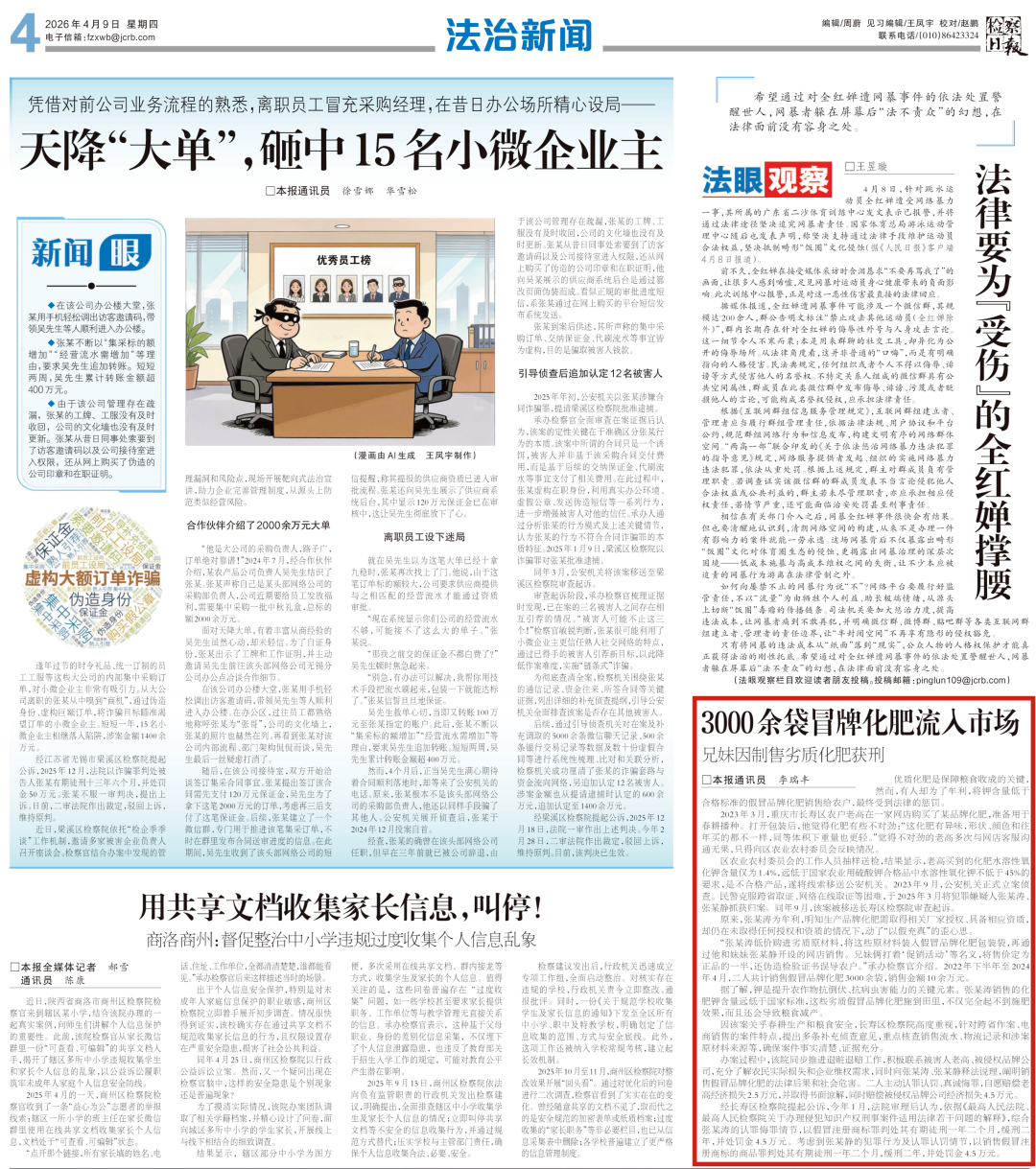 2026年4月9日,《检察日报》第4版刊登《3000余袋冒牌化肥流入市场——兄妹因制售劣质化肥获刑》一文,内容如下: