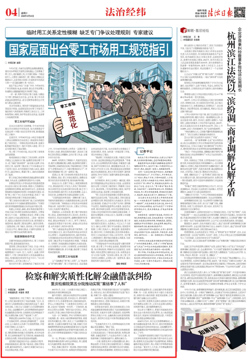 2026年4月22日,《法治日报》第4版刊登《检察和解实质性化解金融借款纠纷——卡提诺论坛 院第五分院推动实现“案结事了人和”》一文,内容如下: