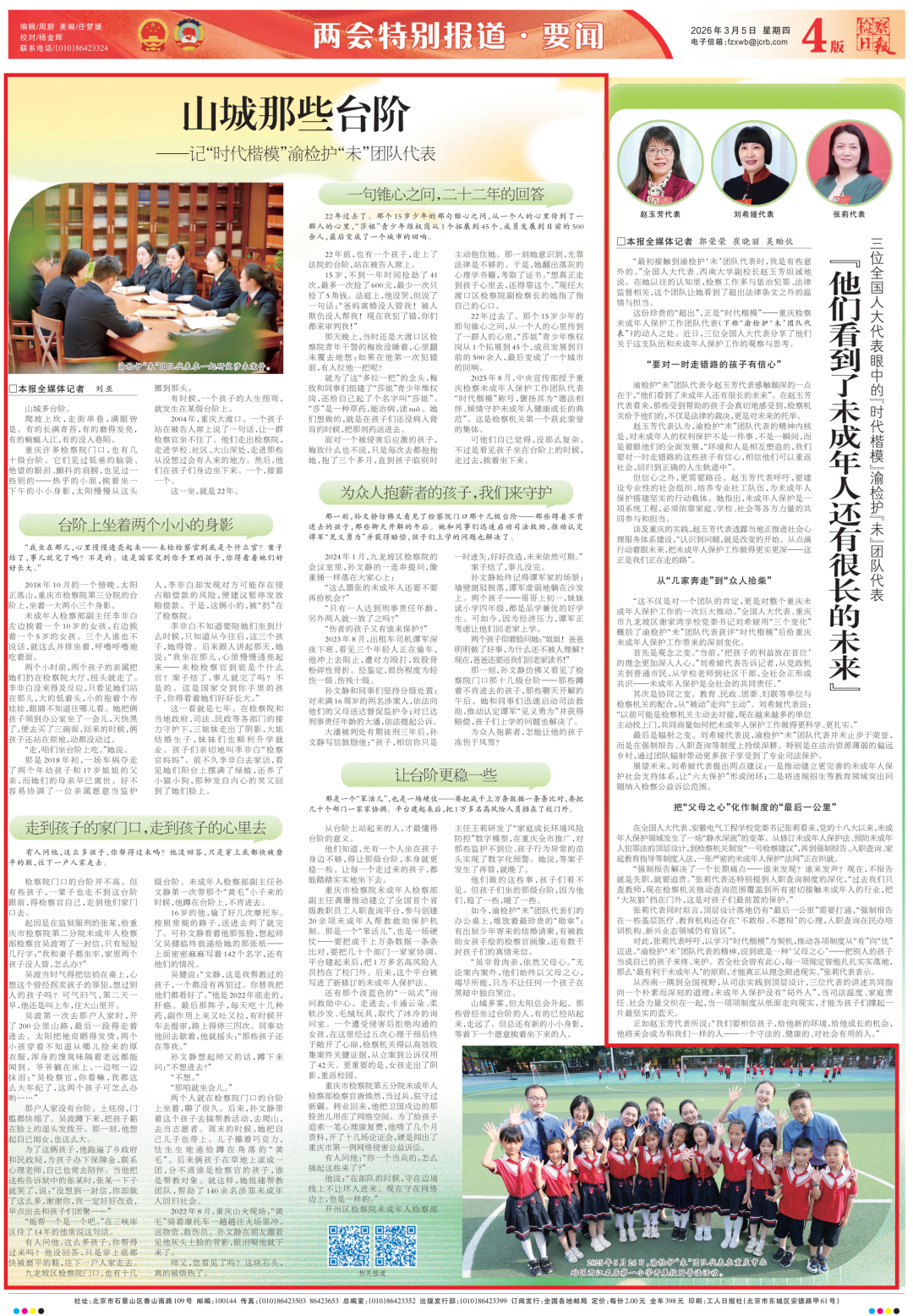 2026年3月5日,《检察日报》第4版“两会特别报道·要闻”专栏刊登《山城那些台阶——记“时代楷模”渝检护“未”团队代表》一文,内容如下: