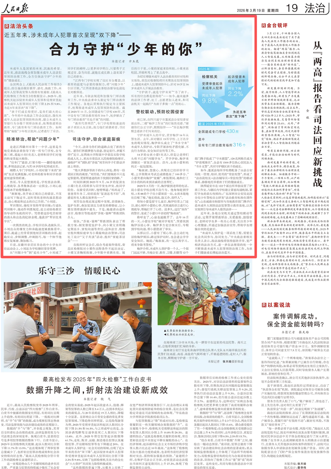 2026年3月19日,《人民日报》第19版“法治头版”专栏刊登合力守护“少年的你”》一文,其中对荣昌区检察院用司法守护弥合家庭裂痕的事迹进行了报道,内容如下: