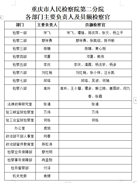 重庆市检察院第二分院各部门主要负责人及员额检察官