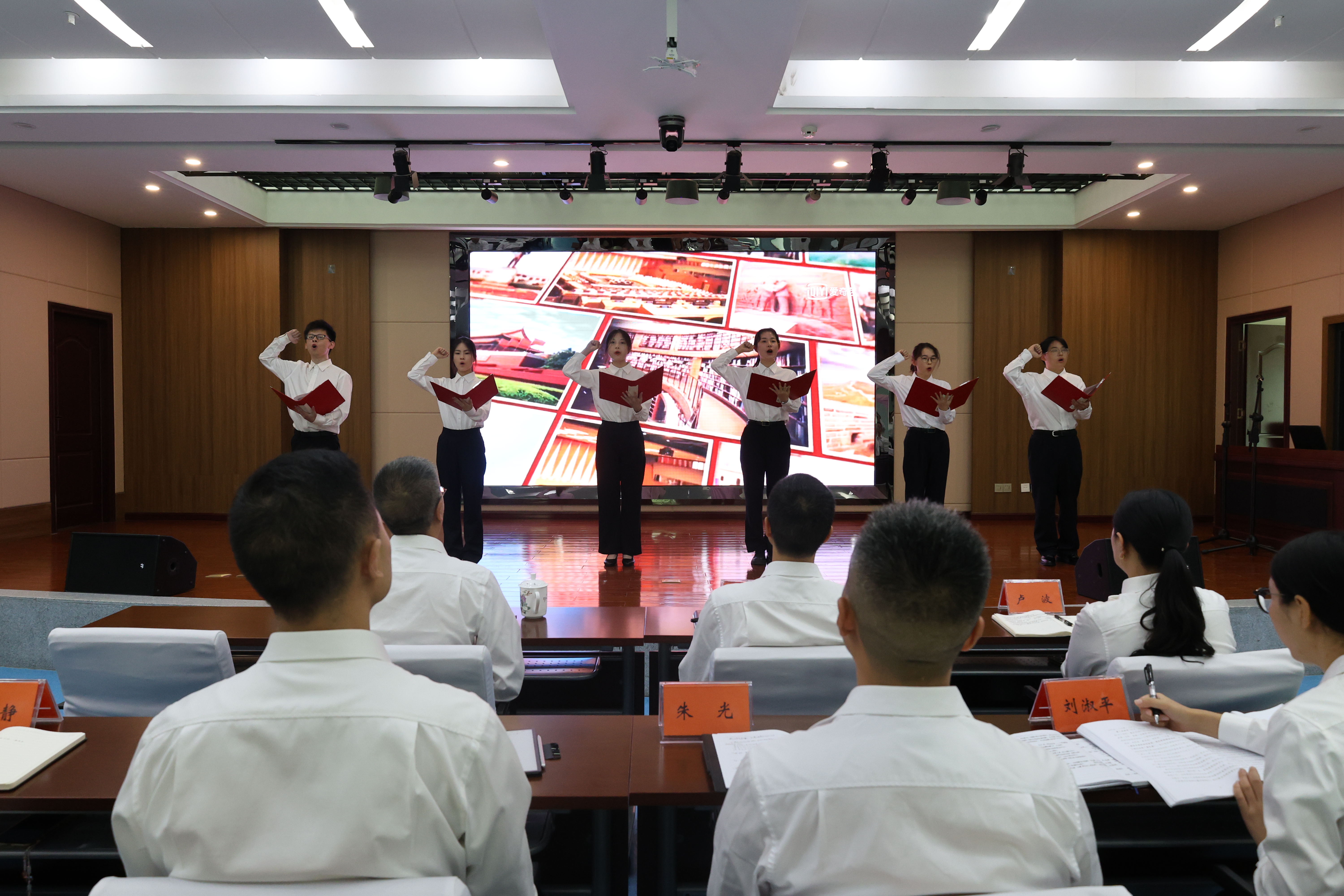 入党誓词铿锵回荡,全体党员紧握右拳的手缓缓放下。随后,熟悉的旋律响起,大家齐声高唱《没有共产党就没有新中国》,激昂歌声中,初心与使命在检察蓝的方阵里愈发鲜明。