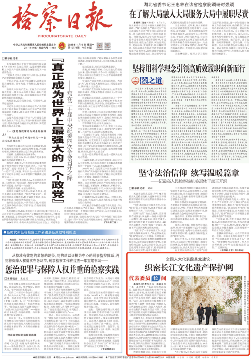 2025年1月6日,《检察日报》头版刊登《全国人大代表殷其龙建议:织密长江文化遗产保护网》一文,内容如下:强司法保障