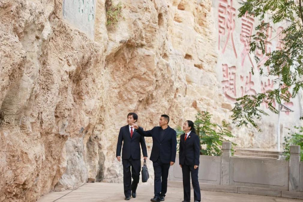 全国人大代表殷其龙(中)与重庆市奉节县检察院检察官实地查看瞿塘峡摩崖石刻保护情况。