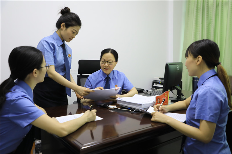 邹黎桃(右二)和干警一起讨论工作