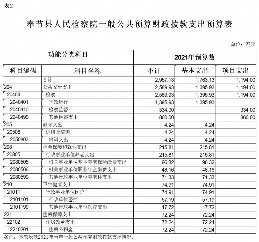 2021年一般公共预算财政拨款收入2957.13万元,一般公共预算财政拨款支出2957.13万元,比2020年增加247.79万元。其中:基本支出1763.13万元,比2020年增加7.79万元,主要原因是单位在编人员变动,人员工资福利正常增加,主要用于保障在职人员工资福利及社会保险缴费,退休人员补助等,保障部门正常运转的各项商品服务支出;项目支出1194万元,比2020年增加240万元,主要原因是增加了新办公大楼信息化建设项目投入,主要用于新办公大楼信息化建设、办案、聘用书记员等重点工作。