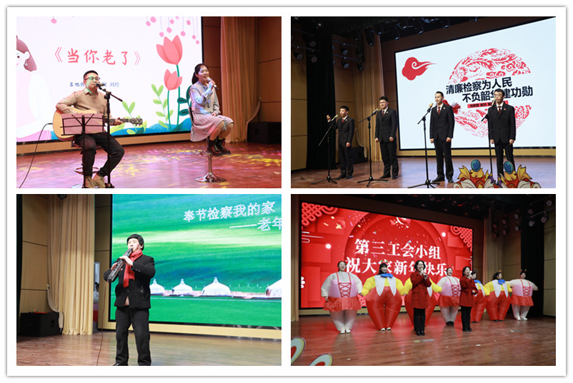 “新年好呀,新年好呀,祝福大家新年好……”活动在院领导班子的合唱《新年好》中拉开帷幕。吉他弹唱、快板、电吹管独奏、拉丁舞、诗朗诵、歌伴舞……一个个精心编排的节目,歌颂着检察工作的不断发展,呈现着检察干警的不懈奋斗,憧憬着检察事业的美好未来,阵阵歌声和掌声,不断将晚会气氛推向高潮。