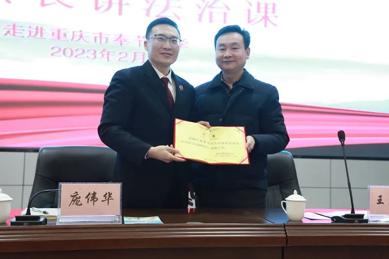 活动中,奉节中学向庞伟华检察长颁发法治副校长聘任证书。庞检也代表县检察院,向奉节中学赠送《莎姐讲故事》普法漫画书100册。