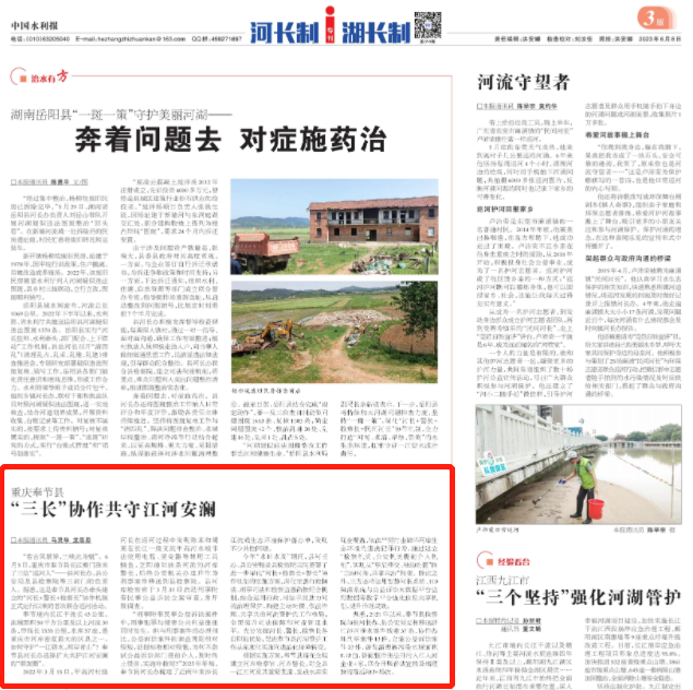 2023年6月8日,《中国水利报》第3版刊登《重庆奉节县:“三长”协作共守江河安澜》一文,内容如下: