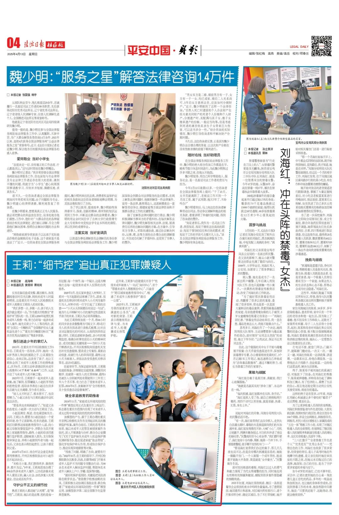 2025年4月13日,《法治日报》第4版“平安中国•身影”专刊刊登《王莉:“细节控”追出真正犯罪嫌疑人》一文,内容如下: