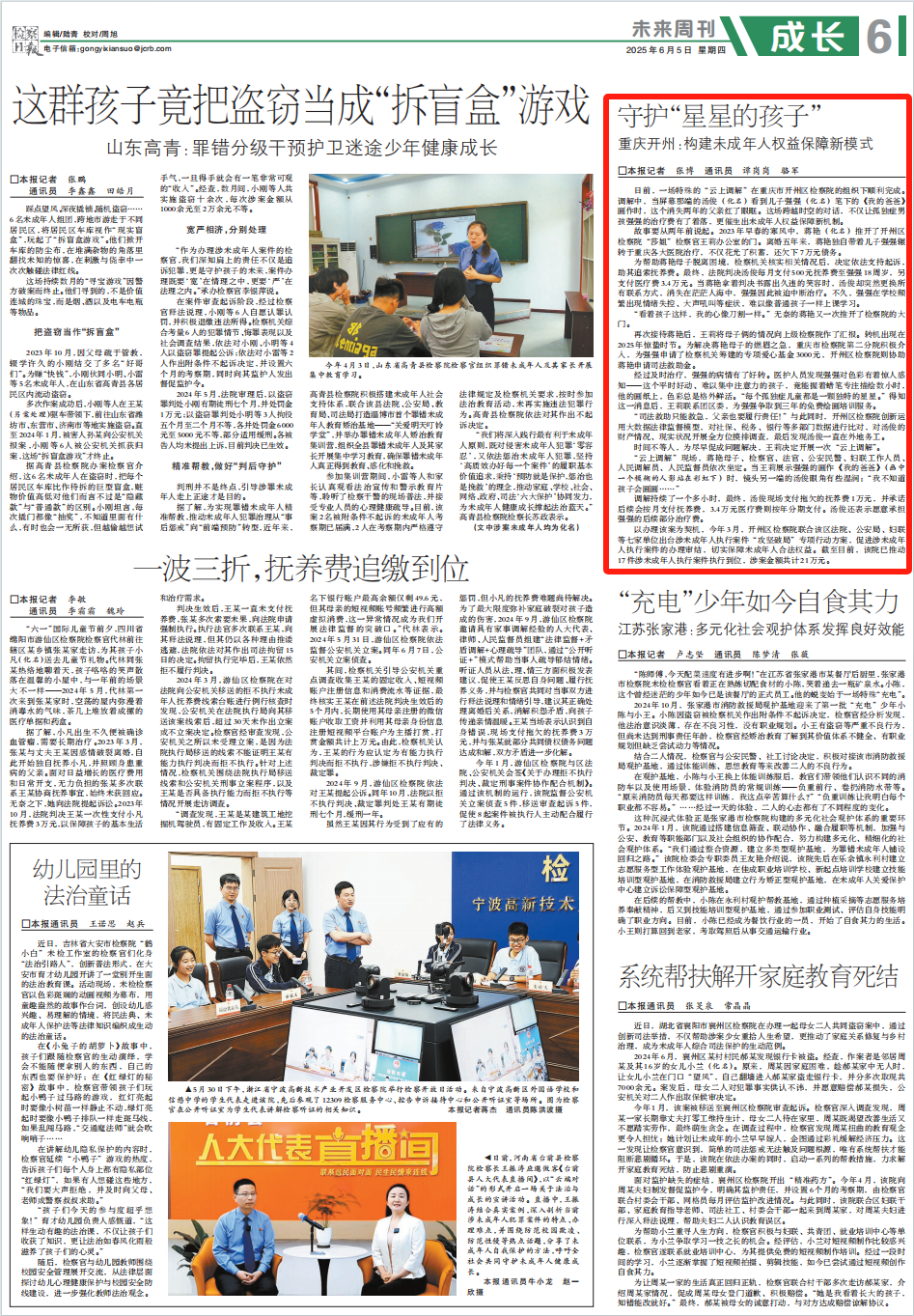 2025年6月5日,《检察日报》第6版刊登《守护“星星的孩子”——重庆开州:构建未成年人权益保障新模式》一文,内容如下: