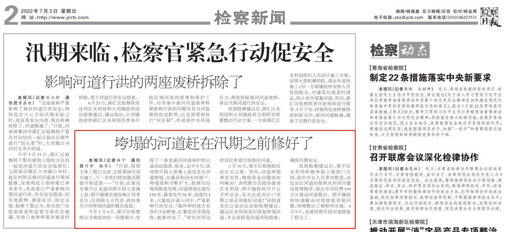 2022年7月3日,《检察日报》第2版刊登《垮塌的河道赶在汛期之前修好了》一文,内容如下: