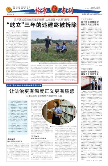 2023年11月3日,《重庆法治报》第4版刊登《梁平区检察院能动履职破解“土地复垦+欠薪”困局 “屹立”三年的违建终被拆除 》一文,内容如下: