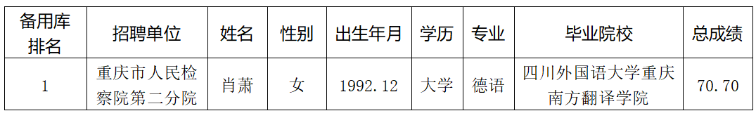 根据《重庆市检察机关公开招聘聘用制书记员简章》的规定,因工作需要,拟从“备用人员库”中按照考生总成绩由高到低顺序补充招聘1名聘用制书记员,现予以公示。