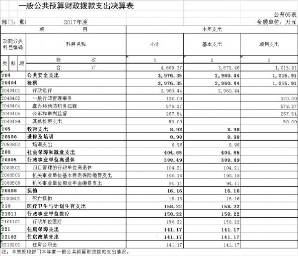 本单位2017年度财政拨款支出主要用于以下方面:公共安全支出3,976.35万元,占84.79%,较年初预算数增加655.42万元,主要是年中财政追加办案经费。教育支出8.98万元,占0.19%,较年初预算数增加0.00万元;社会保障与就业支出404.65万元,占8.63%,较年初预算数减少120.16万元,主要是因为社保改革,2017年3月本单位72名退休人员均纳入社保,单位只发放了1-2月工资;医疗卫生与计划生育支出158.22万元,占3.37%,较年初预算数增加0.00万元;住房保障支出141.17万元,占3.01%,较年初预算数增加0.00万元。