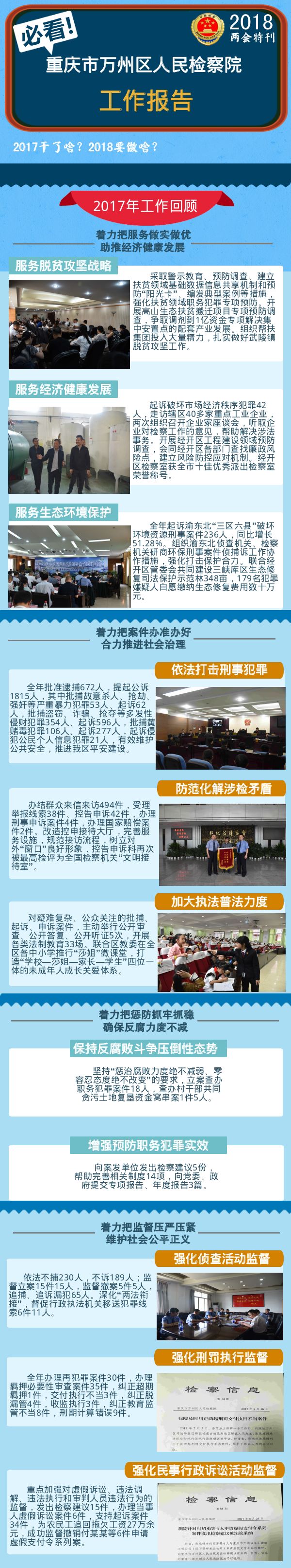 2017年,区检察院以迎接党的十九大胜利召开和认真贯彻落实十九大精神为统领,围绕万州经济社会发展大局和新时期检察工作任务,坚持以平安建设为主线、执法办案为中心、司法改革为动力,切实承担起服务发展、保障民生、维护稳定的政治责任,以扎实有效的检察工作迎接新时代、践行新机制、创造新业绩,为万州经济社会发展提供有力司法保障。
