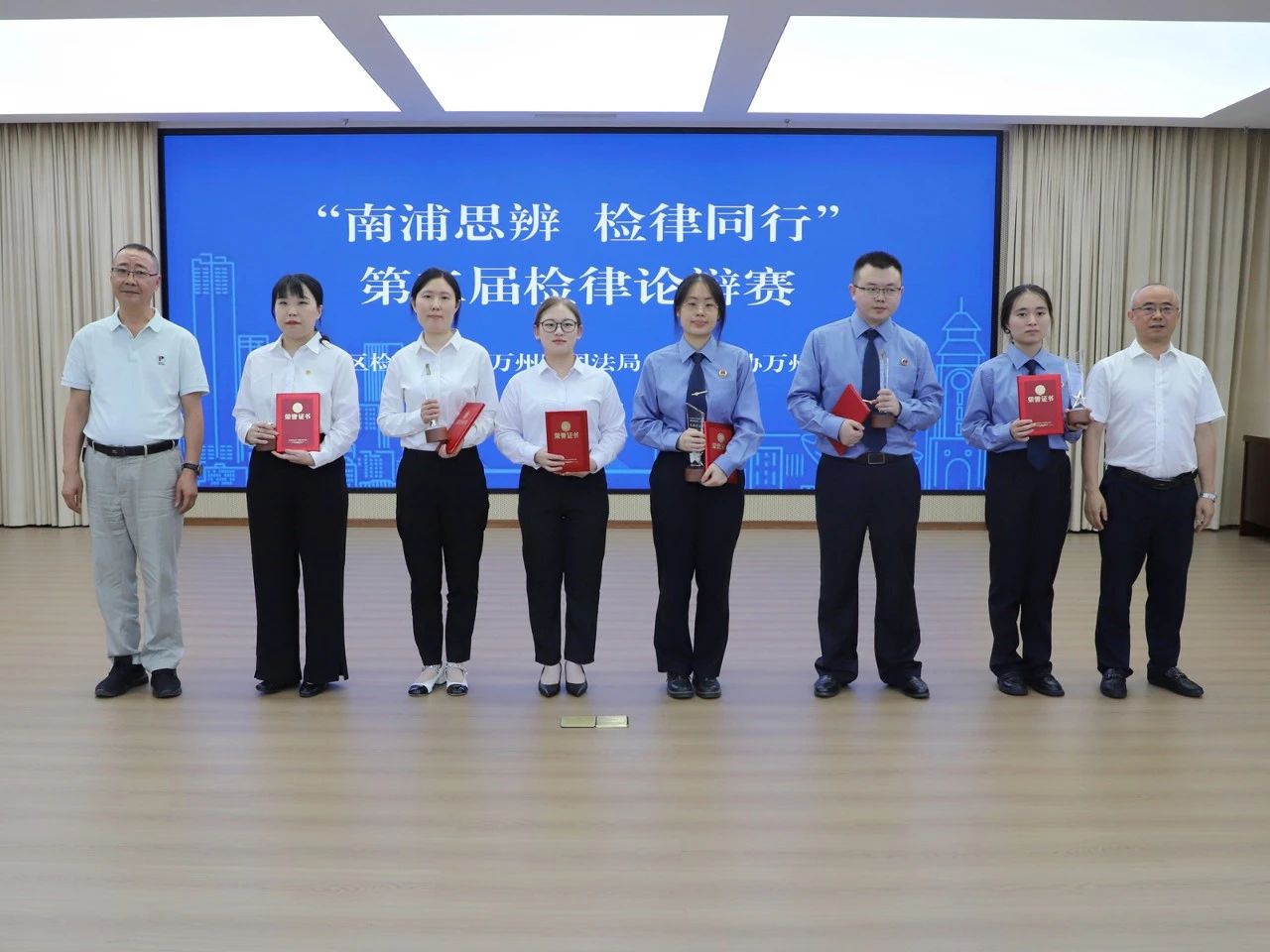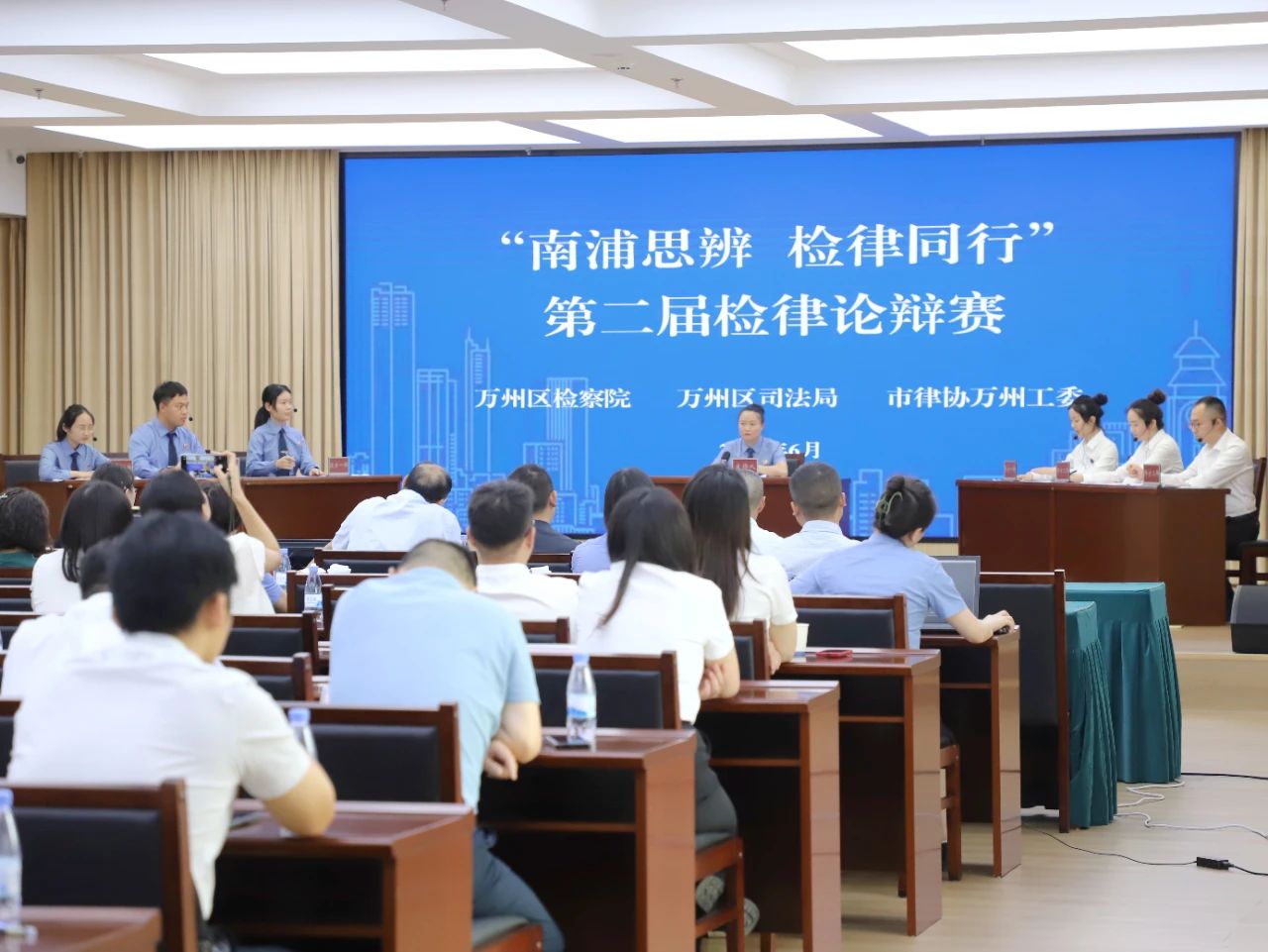 第二分院检察一部副主任谭强,重庆市人大代表、市律协副会长、万州律工委主任刘召奎,重庆三峡学院公共管理学院法学系教授扈力,重庆市人大代表魏彬及万州区检察院相关领导参加活动。区检察院、区司法局、律协共计百余名青年到场观赛学习。