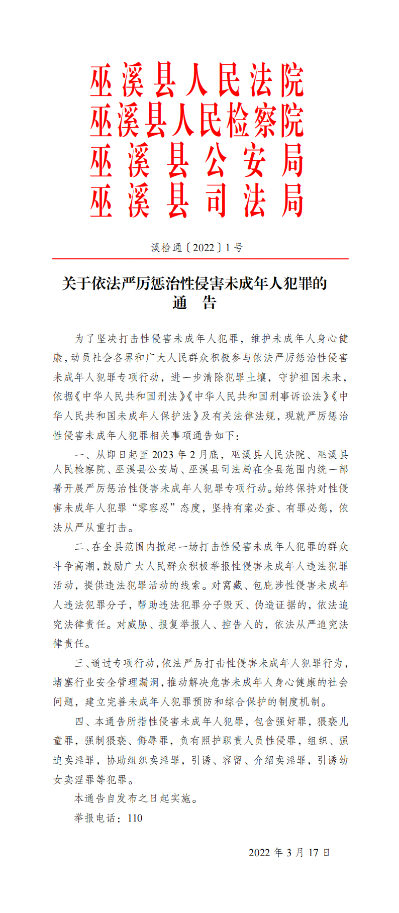 巫溪县人民法院 巫溪县人民检察院 巫溪县公安局 巫溪县司法 局关于依法严厉惩治性侵害未成年人犯罪的通告
