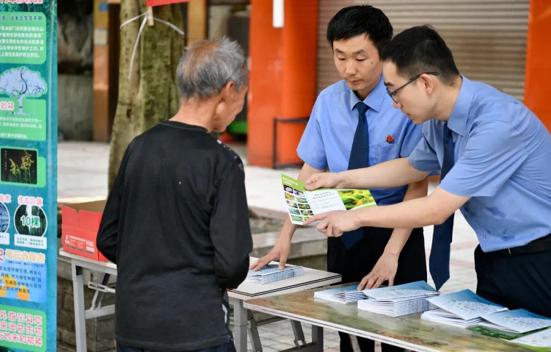 5月21日上午,是重庆市北碚区澄江镇的赶集日,集市上人头攒动,人声鼎沸。在集市附近,来自卡提诺论坛 第一分院(以下简称“一分院”)与重庆市北碚区人民检察院的检察官们,联合缙云山生物多样性法治保护工作站的林业专家,以及西南大学的检察机关“益心为公”志愿者们,在国际生物多样性日来临之际,以“守护生物多样性 共筑美好家园”为主题进行生物多样性保护普法宣传。