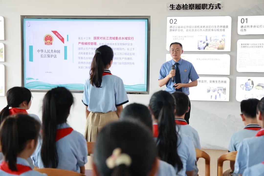 “同学们,学了这么多,谁能说说哪些破坏生态的行为不能做?”情景剧尾声,检察官在法治课上进行随堂小测试。“长江不能钓鱼。”“河滩不能种菜。”“不能盲目放生。”孩子们纷纷举手抢答,立志成为长江小卫士。