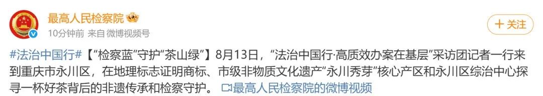 8月13日,“法治中国行·高质效办案在基层”重庆行记者一行来到重庆市永川区,在地理标志证明商标、市级非物质文化遗产永川秀芽核心产区探寻一杯好茶背后的非遗传承和检察守护。