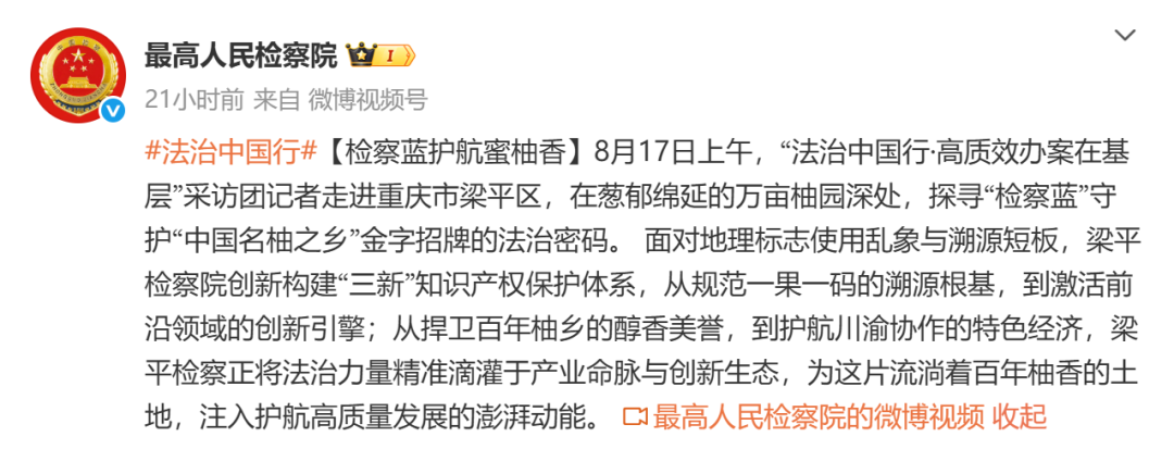 2024年下半年以来,梁平区检察院联合区农业农村委、区市场监督管理局等部门开展了地理标志综合保护专项行动,推动相关部门进一步加大监督抽检力度,完善风险监测预警体系,着力构建起“源头可溯、过程可控、质量可保”的全程品质管控体系,为梁平柚产业高质量发展筑牢法治屏障。