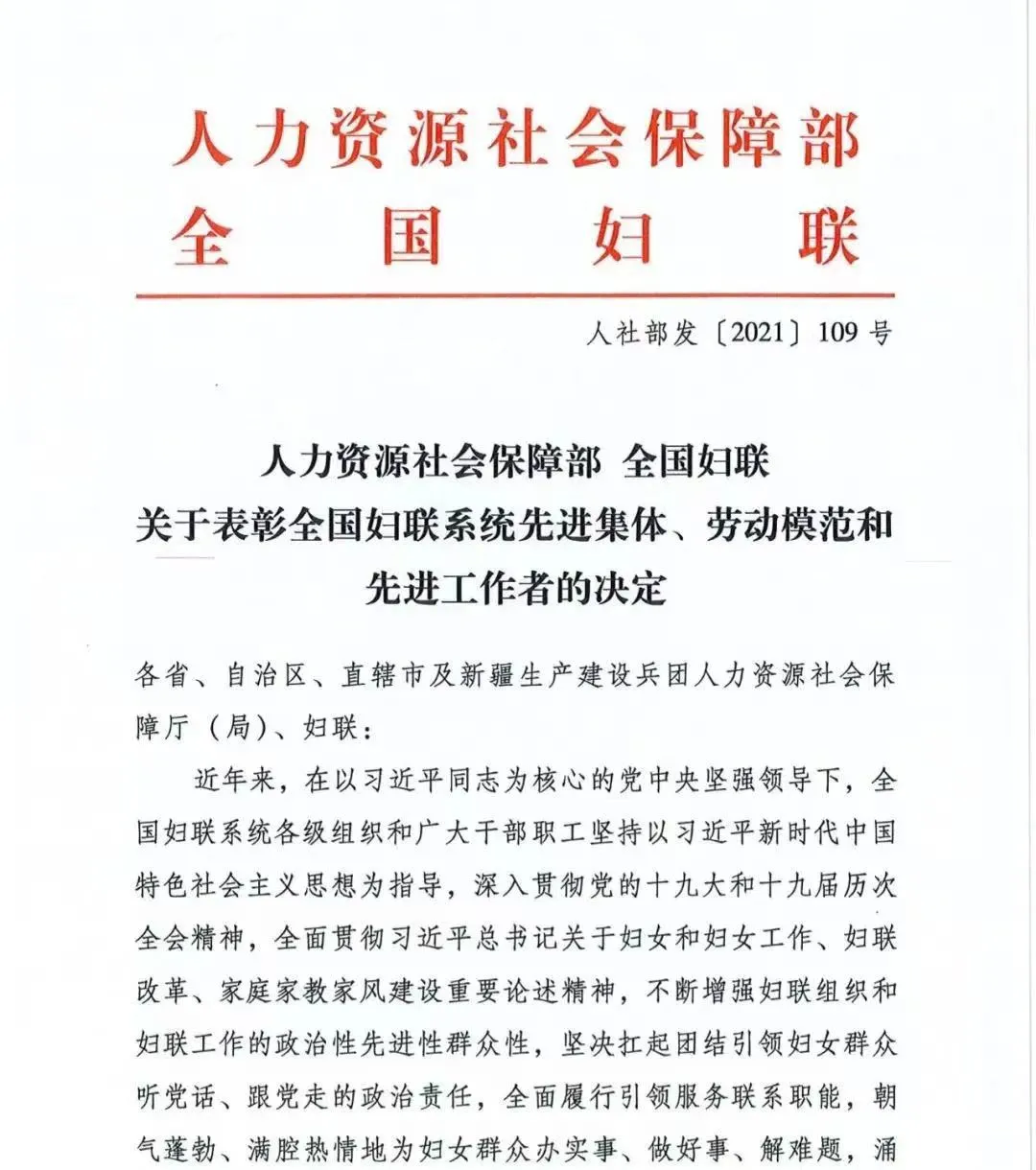 日前,人力资源和社会保障部、全国妇联联合印发《关于表彰全国妇联系统先进集体、劳动模范和先进工作者的决定》,全国150个单位荣获“全国妇联系统先进集体”称号,100名个人荣获“全国妇联系统劳动模范”称号,100名个人荣获“全国妇联系统先进工作者”称号。其中,重庆市女检察官协会作为全国妇联团体会员三个获奖单位之一,荣获全国妇联系统先进集体称号,也是全国检察系统唯一获此殊荣的单位。