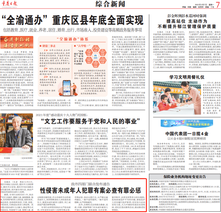2022年3月7日,《重庆日报》第7版刊登《我市四部门联合发布通告 性侵害未成年人犯罪有案必查有罪必惩》一文,内容如下: