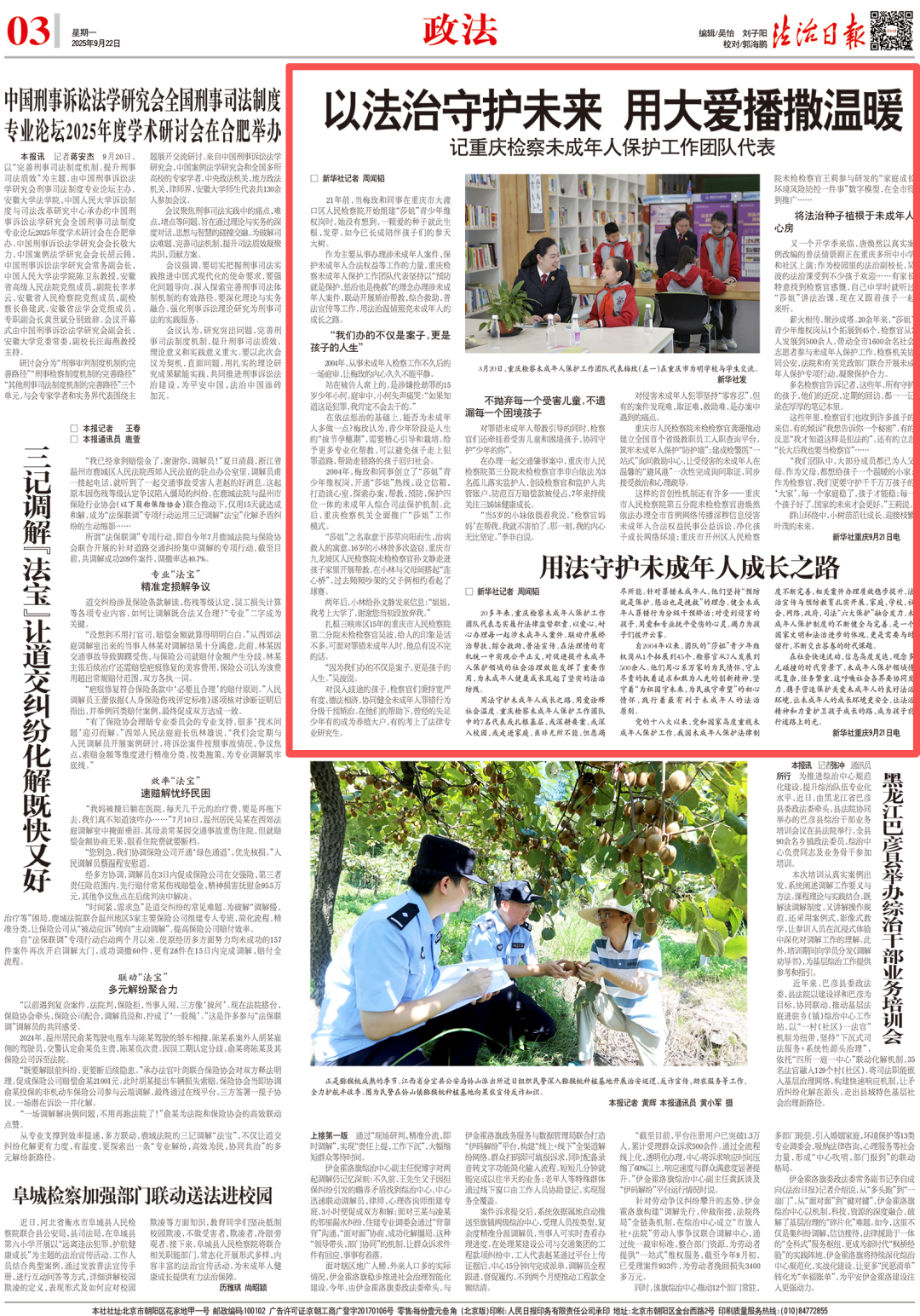 2025年9月22日,《法治日报》第3版刊登《以法治守护未来 用大爱播撒温暖——记卡提诺论坛