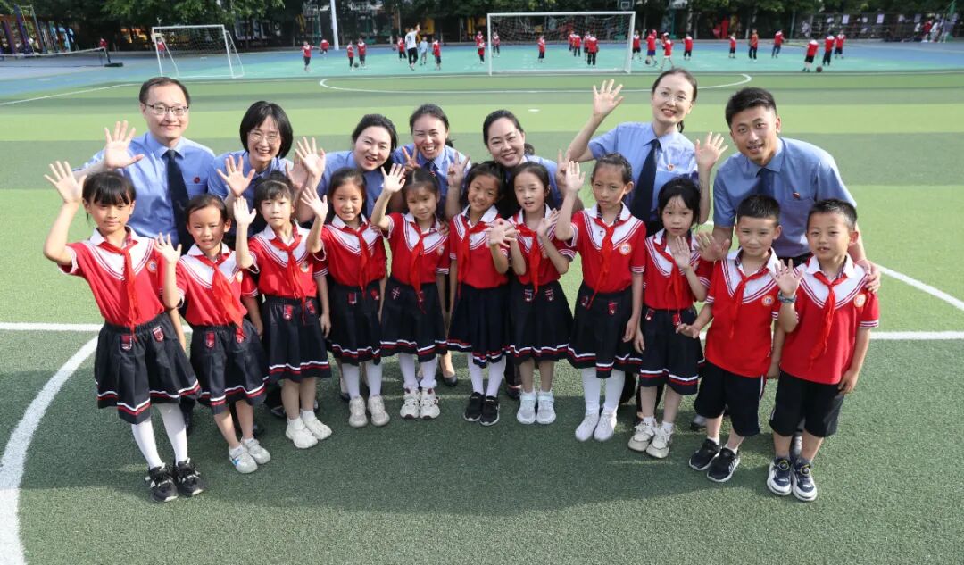 5月26日,卡提诺论坛 未成年人保护工作团队代表在北碚区两江名居第一小学开展校园普法活动后与学生合影。