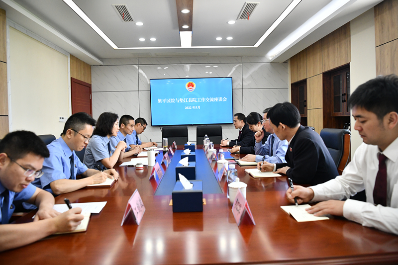 巡河结束后,双方前往垫江县院召开交流座谈会。会上,两院主要围绕深化落实协作机制进行了交流探讨,并对公益诉讼、队伍建设等工作进行交流学习。期间,梁平区院阳彬检察长一行还参观了垫江县院未检办案区、办公楼文化建设等。
