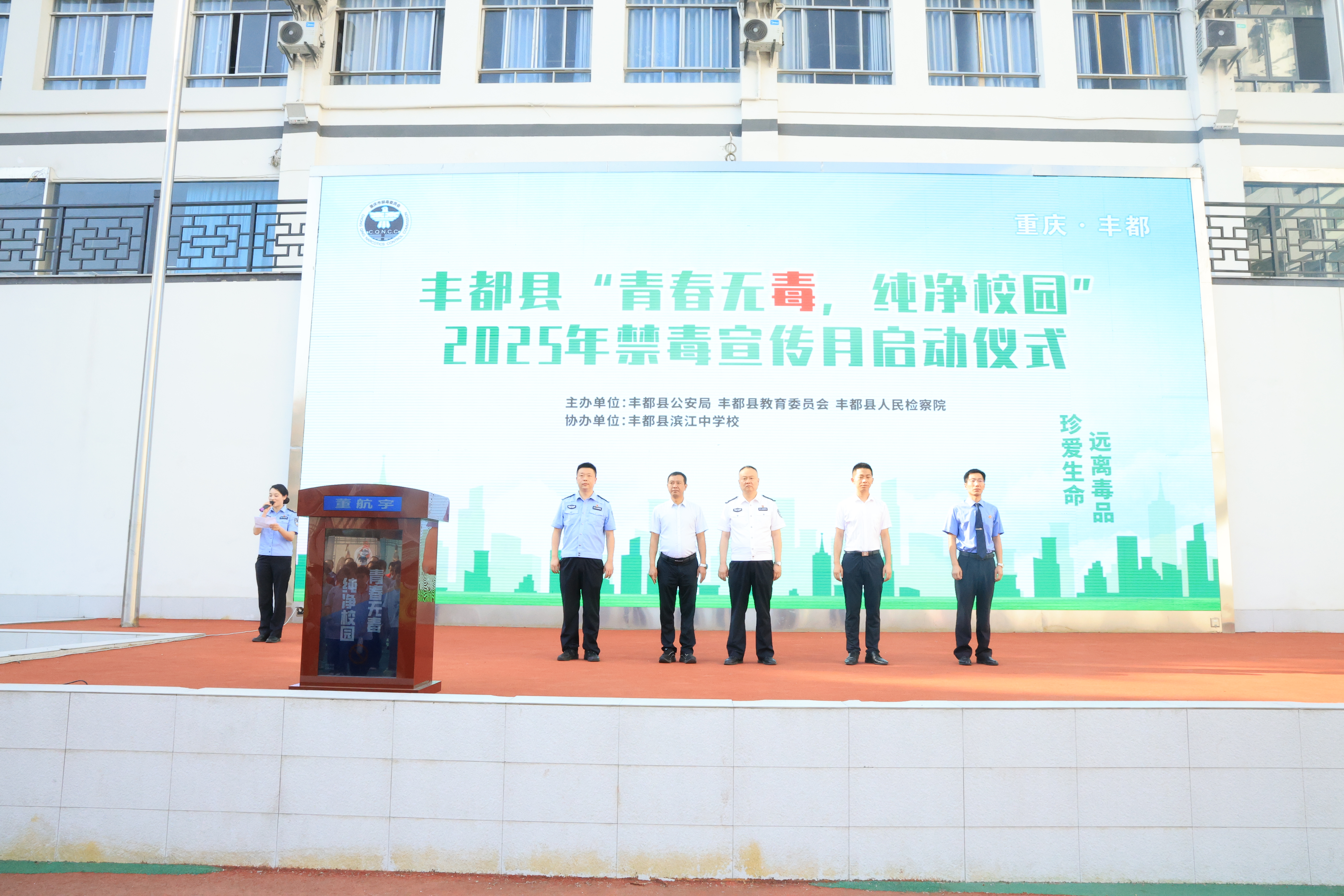 6月17日上午,我院联合县公安局、县教委在丰都县滨江中学开展“青春无毒,纯净校园”禁毒宣传游园会。丰都县副县长周君、我院检委会专职委员胡汉出席活动启动仪式。