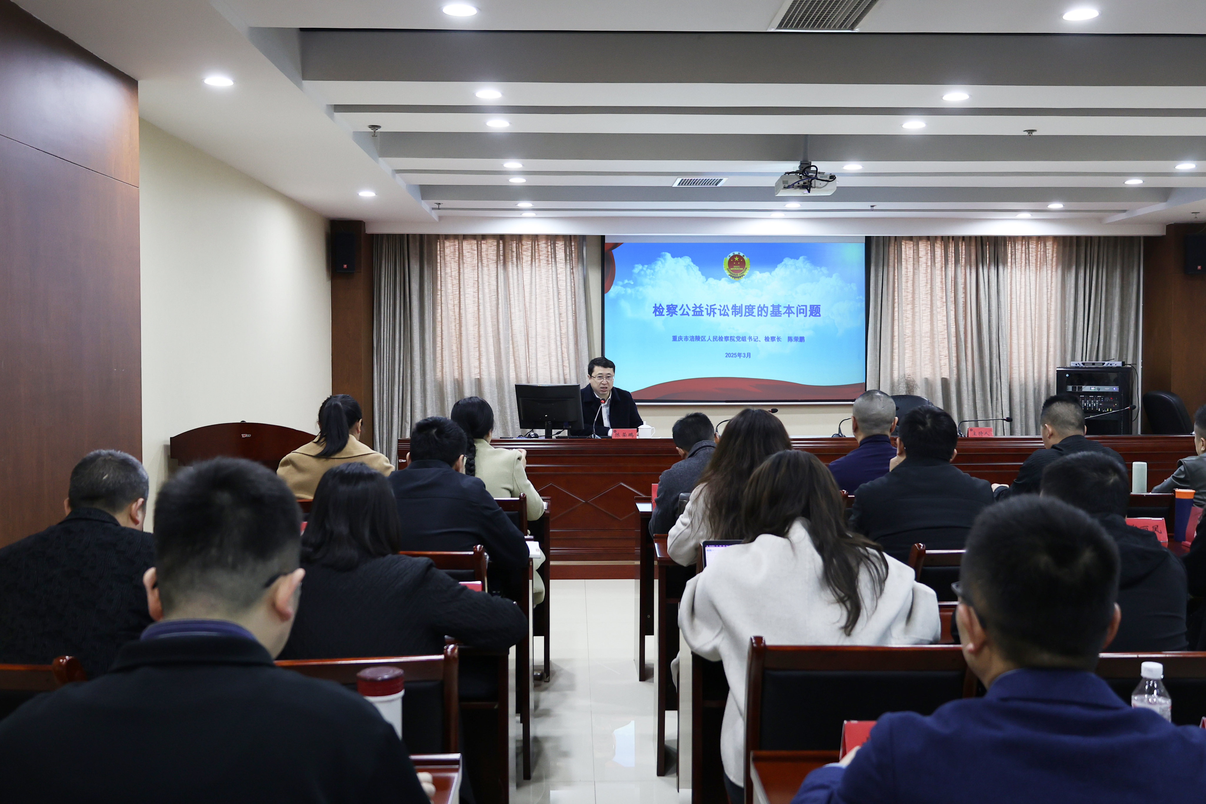 3月24日,涪陵区检察院党组书记、检察长陈荣鹏走进区委党校,为涪陵区2025年中青年干部培训班50余名学员作检察公益诉讼制度的基本问题专题辅导报告。