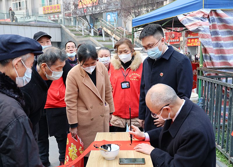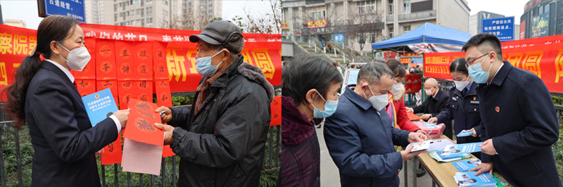 1月12日,我院检委会专职委员王建华带领检察干警到涪陵区重百步行街开展“检察官陪你聊法治、过春节”新春反诈主题活动。检察官以案释法、挥毫泼墨,为现场群众送上了一张张特别的新年“防骗反诈宣传画”和“法治春联”。
