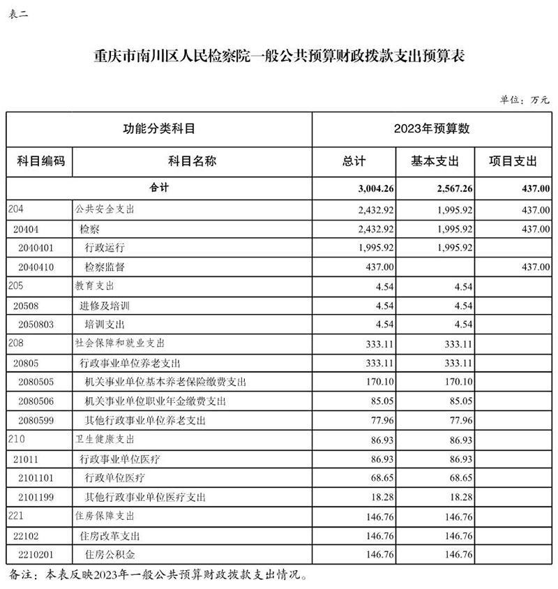 (二)支出预算:2023年年初预算数3004.26万元,其中:公共安全支出2432.92万元,教育支出4.54万元,社会保障和就业支出333.11万元,卫生健康支出86.93万元,住房保障支出146.76万元。支出预算较2022年增加560.42万元,主要是基本支出预算增加598.12万元,项目支出预算减少37.7万元。