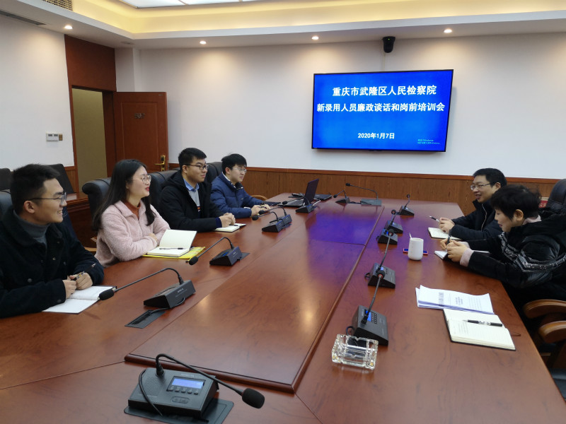 为进一步激发新进人员干事创业激情,使新进人员正确理解检察机关作为国家法律监督机关的性质、职能、地位,培养检察职业素养,筑牢廉洁自律思想防线,快速适应工作、熟悉环境。近日,武隆区院组织4名新招录公务员召开了新进人员廉政谈话和岗前培训会。院党组成员、纪检组长程琼、党组成员,政治部主任陈先伦出席会议。
