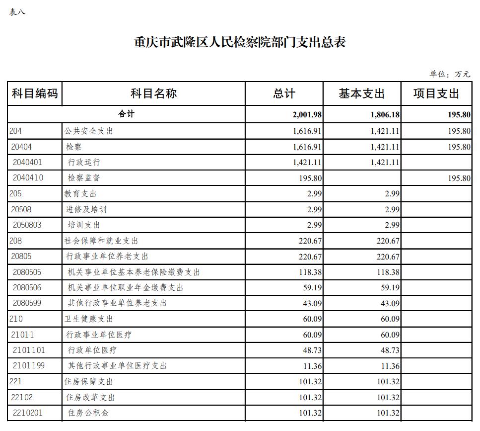 (二)支出预算:2023年年初预算数2001.98万元,其中:一般公共安全支出1616.91万元,教育支出2.99万元,社会保障和就业支出220.67万元,卫生健康支出60.09万元,住房保障支出101.32万元;支出较去年增加250.41万元,主要是基本支出预算增加399.45万元,项目支出预算减少149.04万元。