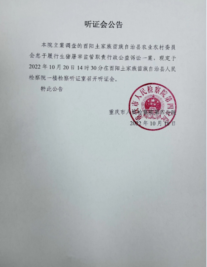 由本院立案调查的酉阳土家族苗族自治县农业农村委员会怠于履行生猪屠宰监管职责行政公益诉讼一案,定于2022年10月20日14:30在酉阳县人民检察院一楼公开听证室举行公开听证会。