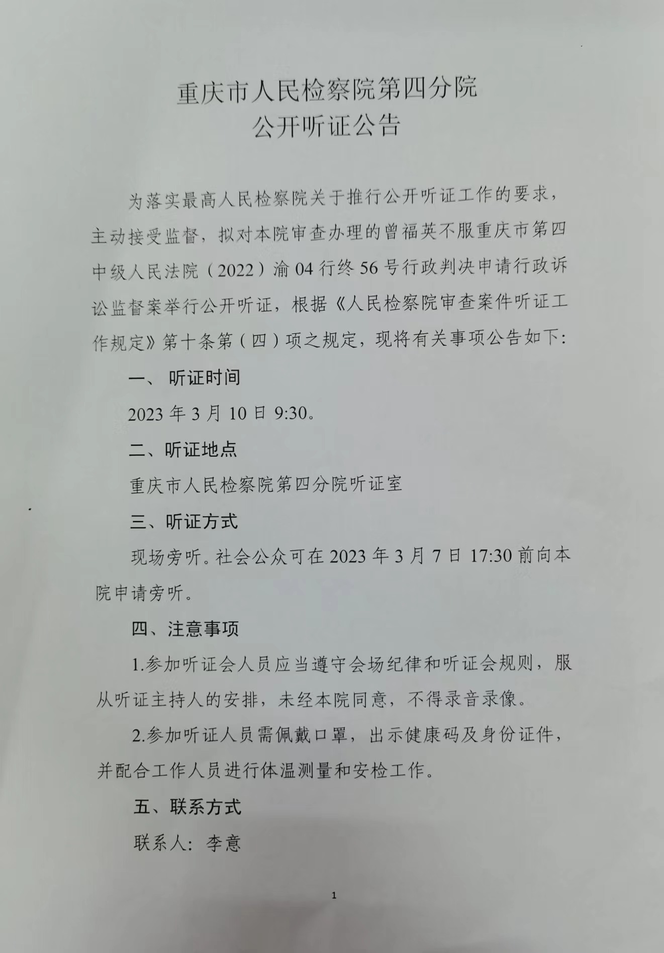 由本院审查办理的曾某某不服重庆市第四中级人民法院(2022)渝04行终56号行政判决申请行政诉讼监督一案,定于2023年3月10日9:30在卡提诺论坛 第四分院听证室举行公开听证会。