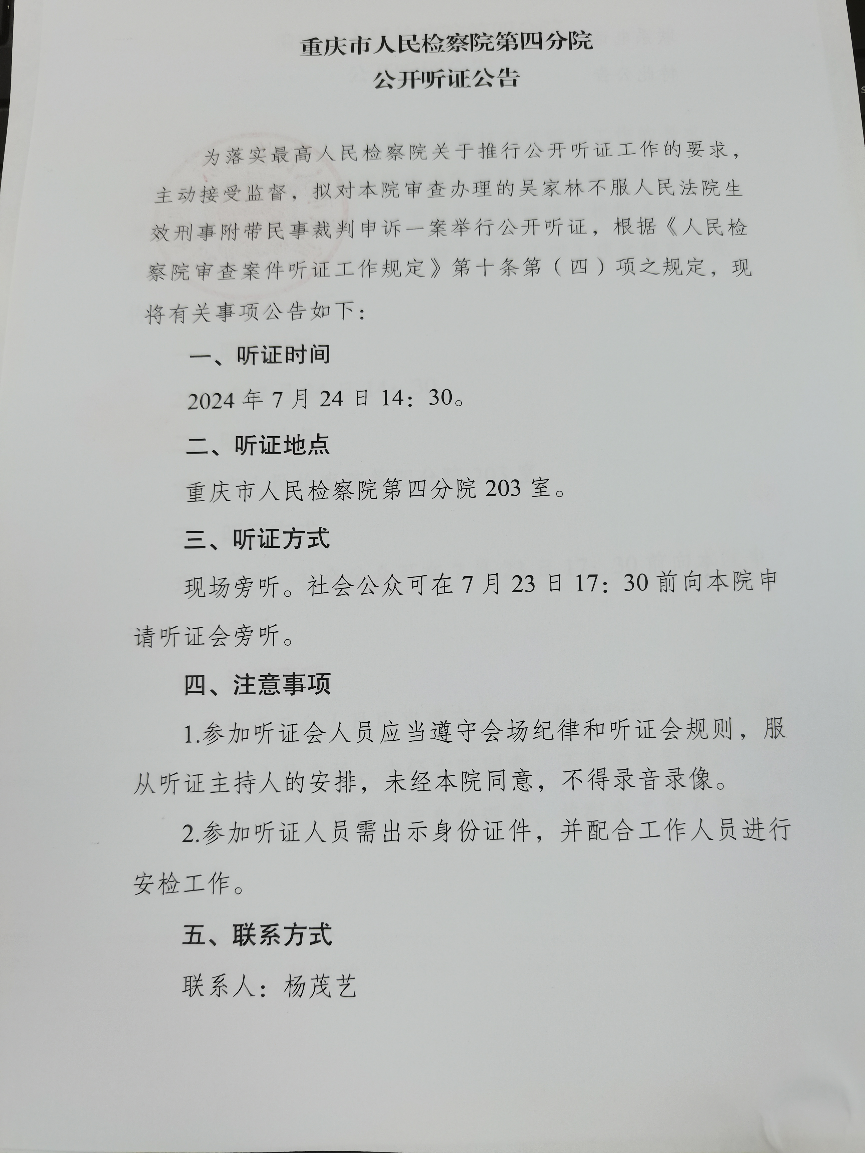 由本院审查办理的吴家林不服人民法院生效刑事附带民事裁判申诉一案,定于2024年7月24日14:30在卡提诺论坛 第四分院203室举行公开听证会。