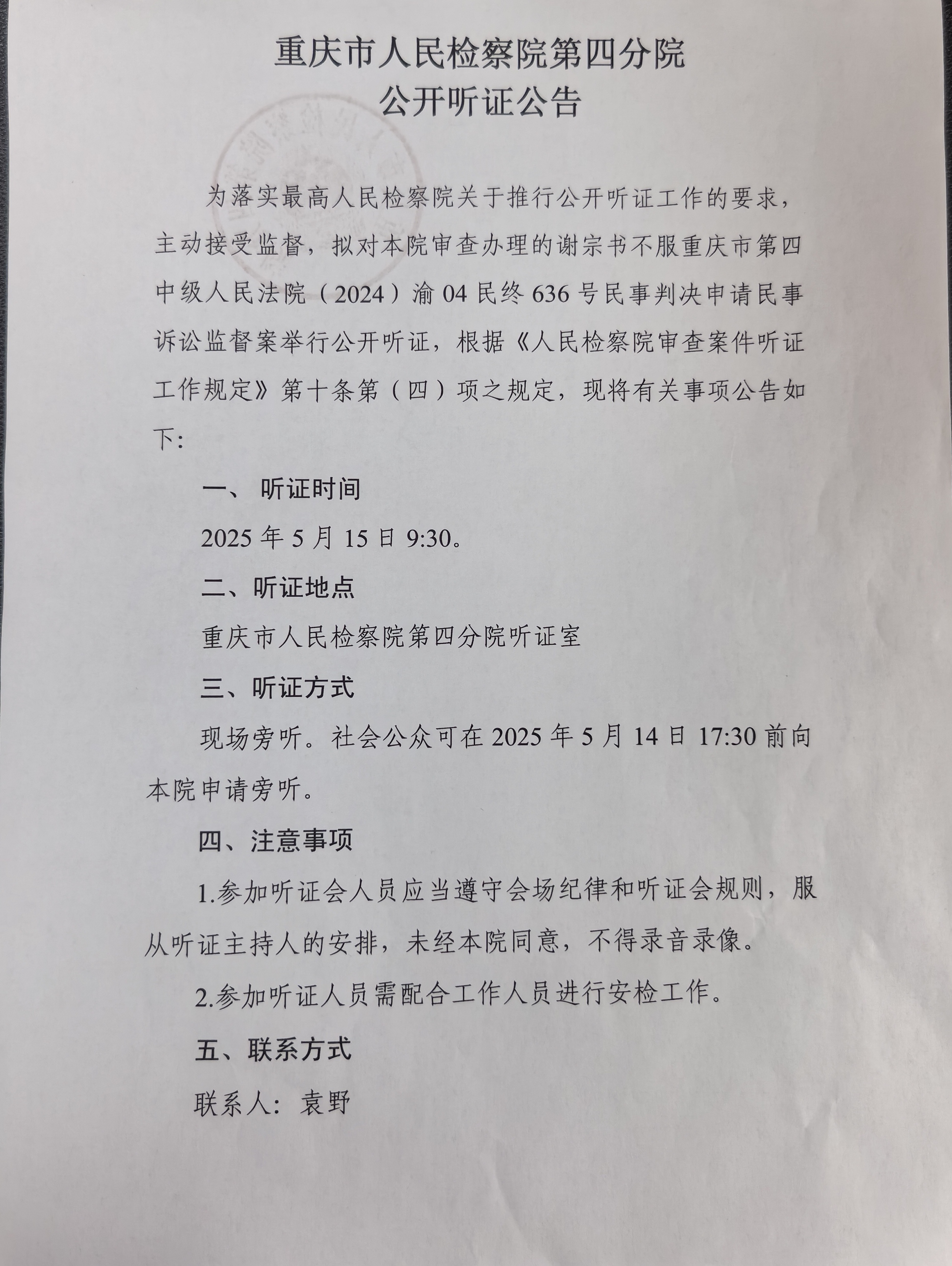 由本院审查办理的谢宗书不服人民法院生效民事判决一案,定于2025年5月15日9:30在卡提诺论坛 第四分院一楼听证室举行公开听证会。