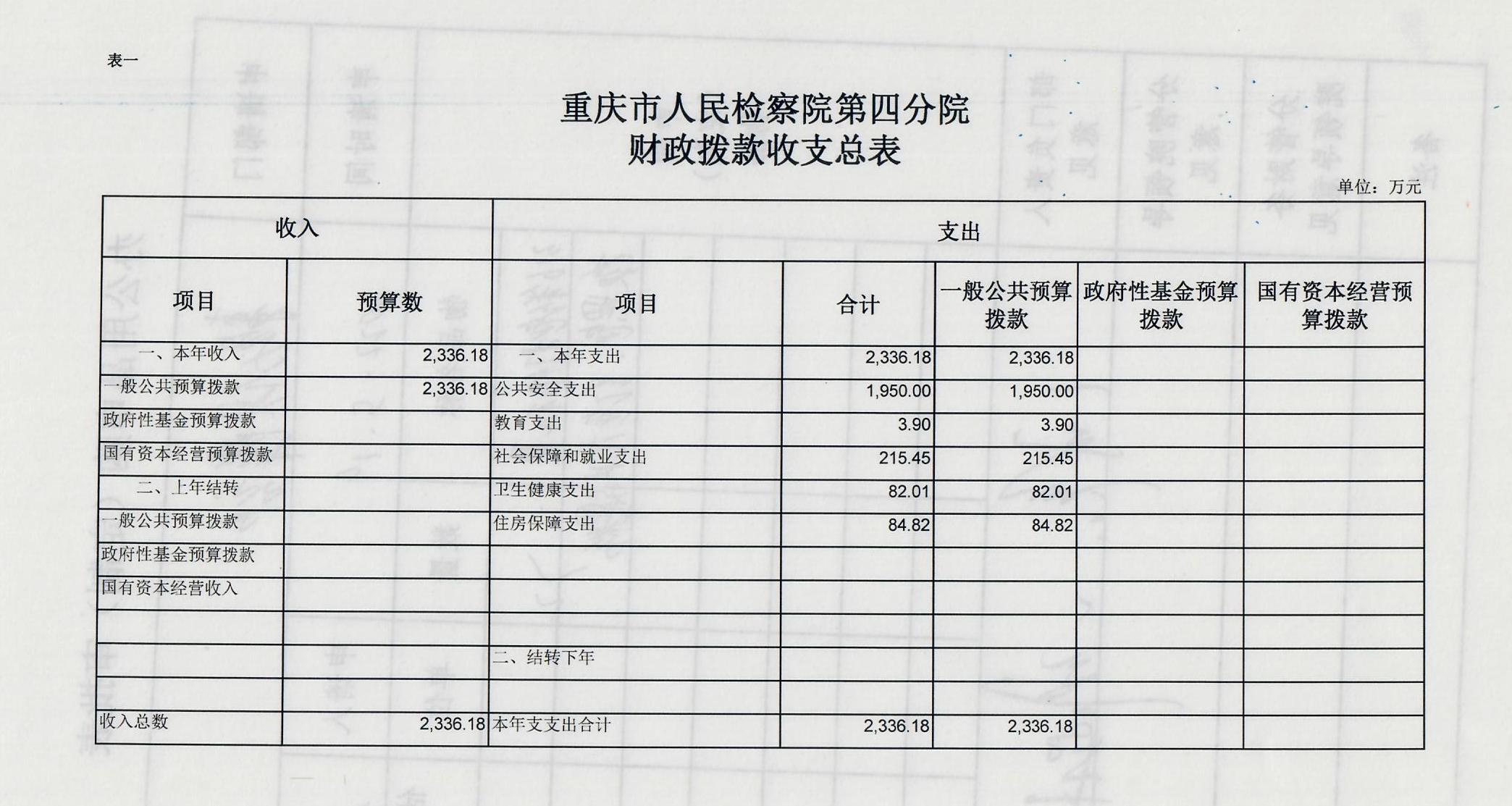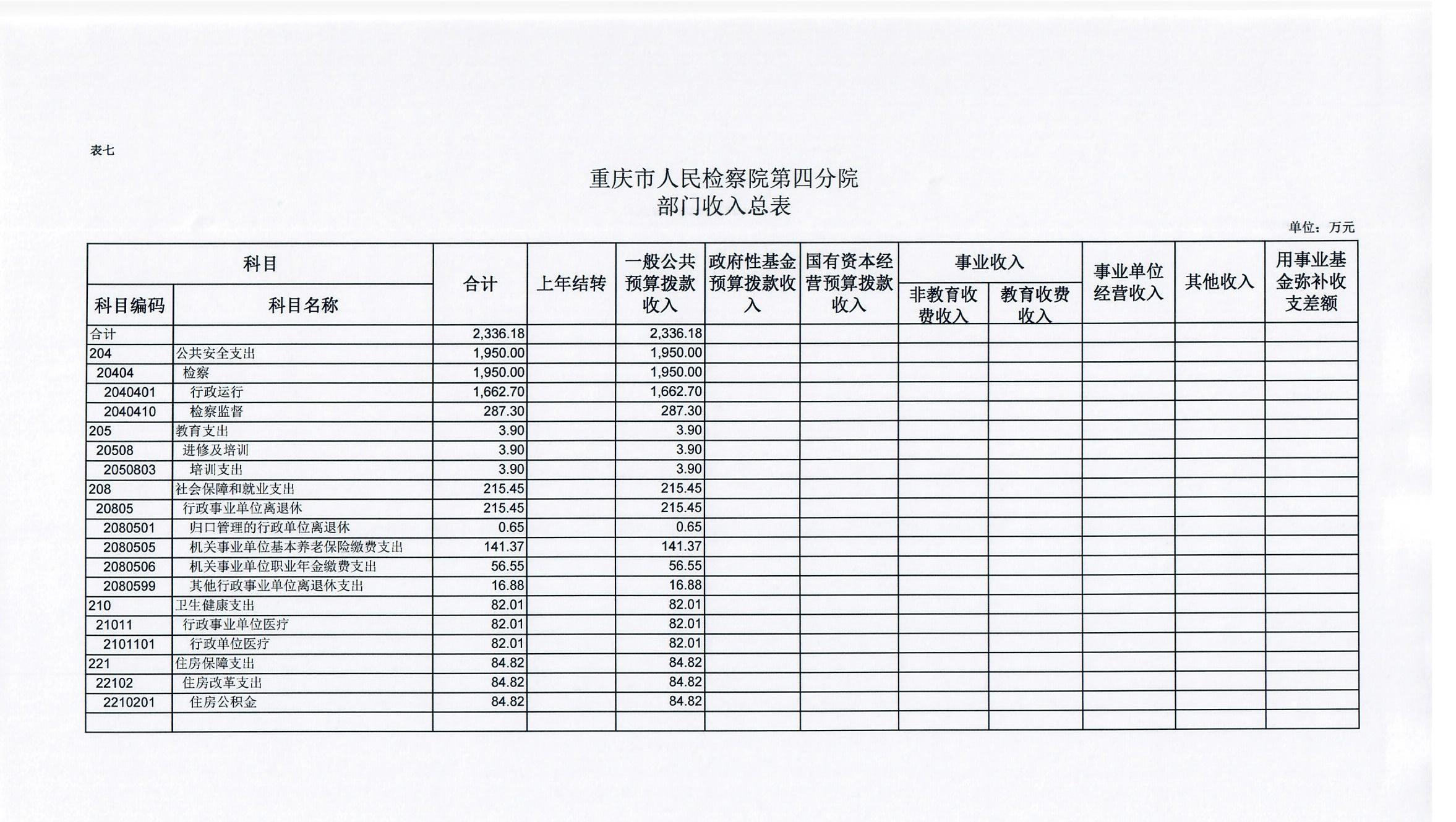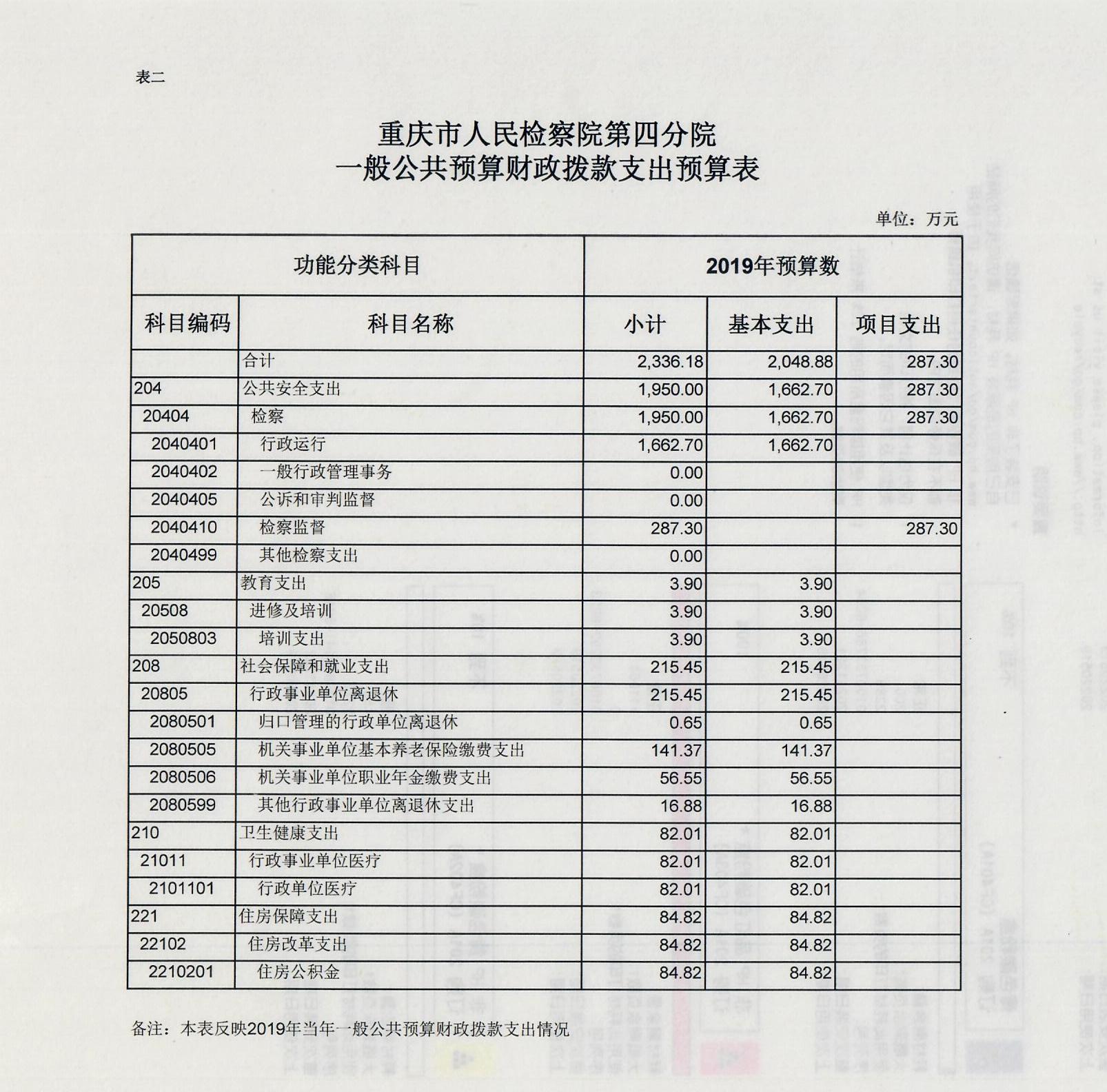 2019年一般公共预算财政拨款收入2336.18万元,一般公共预算财政拨款支出2336.18万元,比2018年减少115.17万元。其中:基本支出2048.88万元,比2018年减少58.47万元,主要原因是根据国家监察体制改革要求,我单位查办和预防职务犯罪等职能划转到重庆市监察委,根据划转人员比例相应减少了公用经费58.74万元,主要用于保障在职人员工资福利及社会保险缴费,退休人员公用经费,保障部门正常运转的各项商品服务支出;项目支出287.3万元,比2018年减少56.7万元,主要原因是根据国家监察体制改革要求,我单位查办和预防职务犯罪等职能划转到重庆市监察委,根据划转人员比例相应减少了办案经费等,公诉、民行、侦监等办案业务经费保障、装备业务采购、聘用制书记员和临聘人员工资等重点工作。