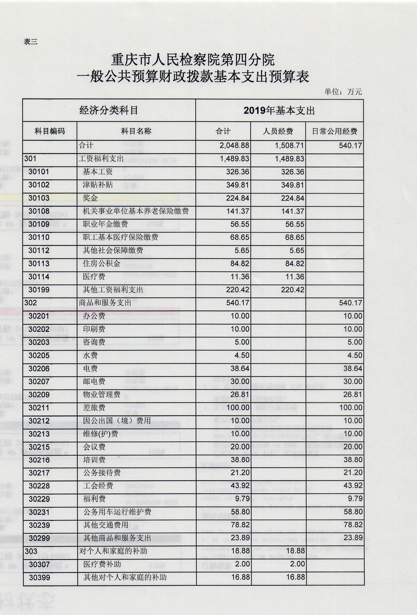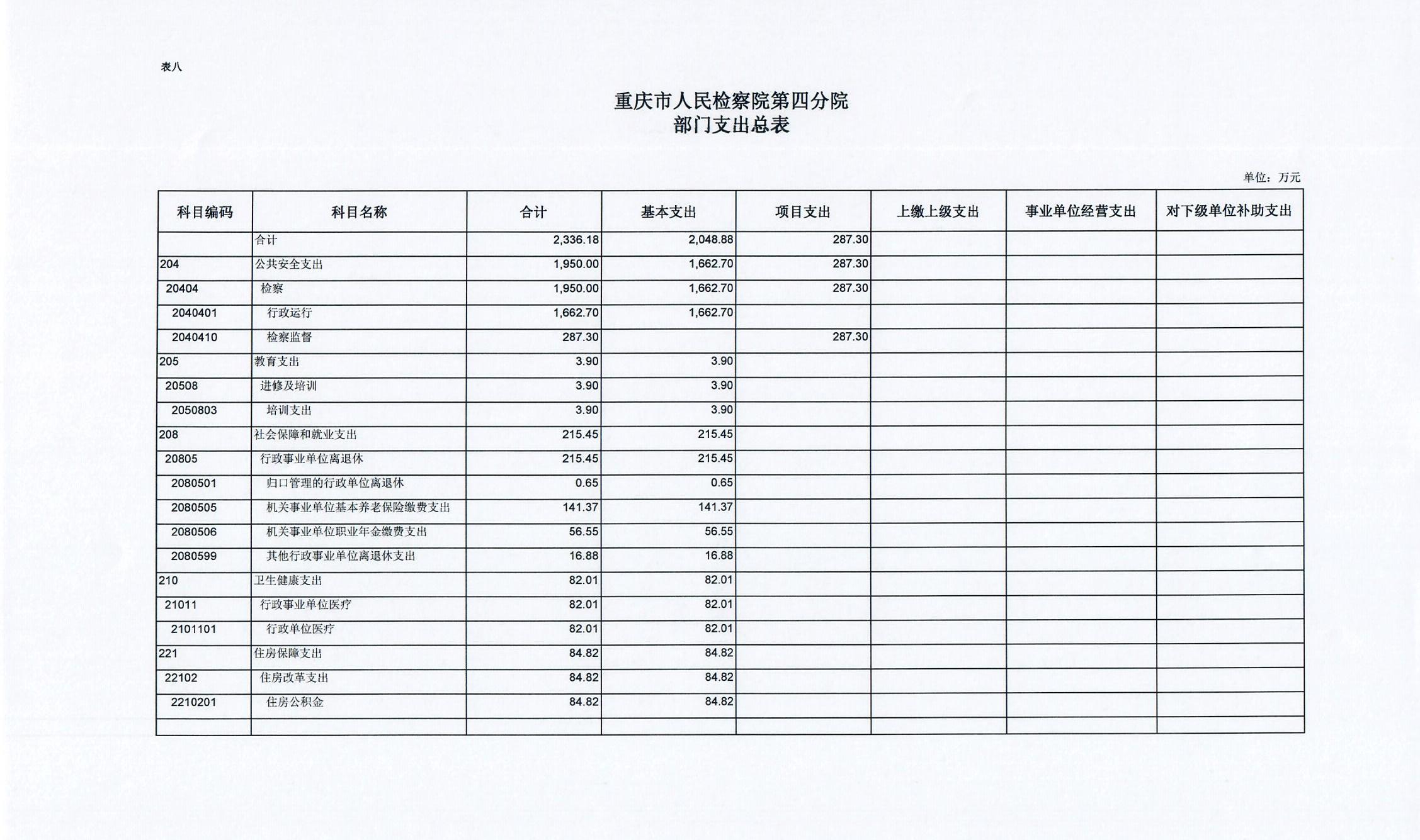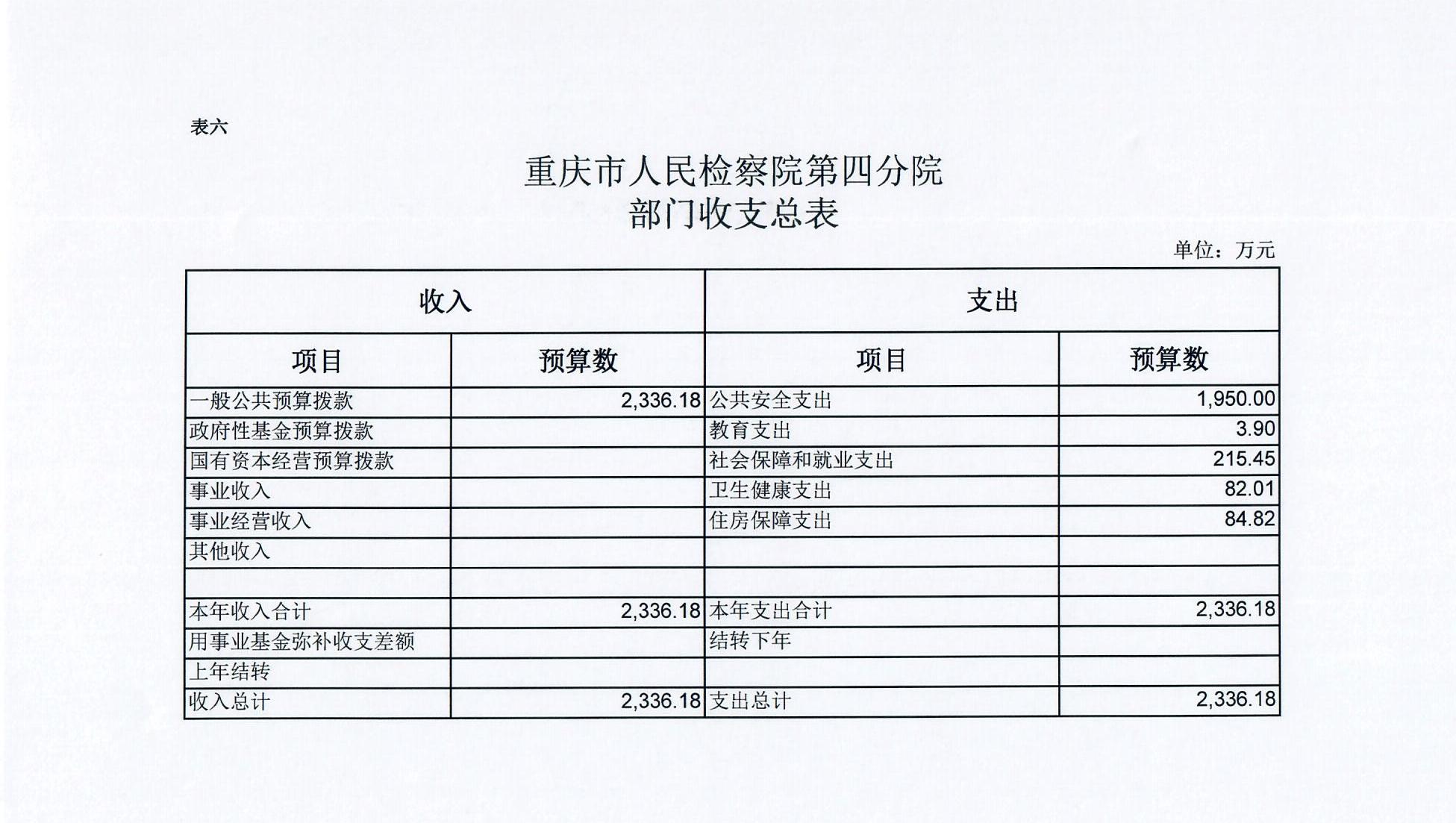 2019年一般公共预算财政拨款收入2336.18万元,一般公共预算财政拨款支出2336.18万元,比2018年减少115.17万元。其中:基本支出2048.88万元,比2018年减少58.47万元,主要原因是根据国家监察体制改革要求,我单位查办和预防职务犯罪等职能划转到重庆市监察委,根据划转人员比例相应减少了公用经费58.74万元,主要用于保障在职人员工资福利及社会保险缴费,退休人员公用经费,保障部门正常运转的各项商品服务支出;项目支出287.3万元,比2018年减少56.7万元,主要原因是根据国家监察体制改革要求,我单位查办和预防职务犯罪等职能划转到重庆市监察委,根据划转人员比例相应减少了办案经费等,公诉、民行、侦监等办案业务经费保障、装备业务采购、聘用制书记员和临聘人员工资等重点工作。