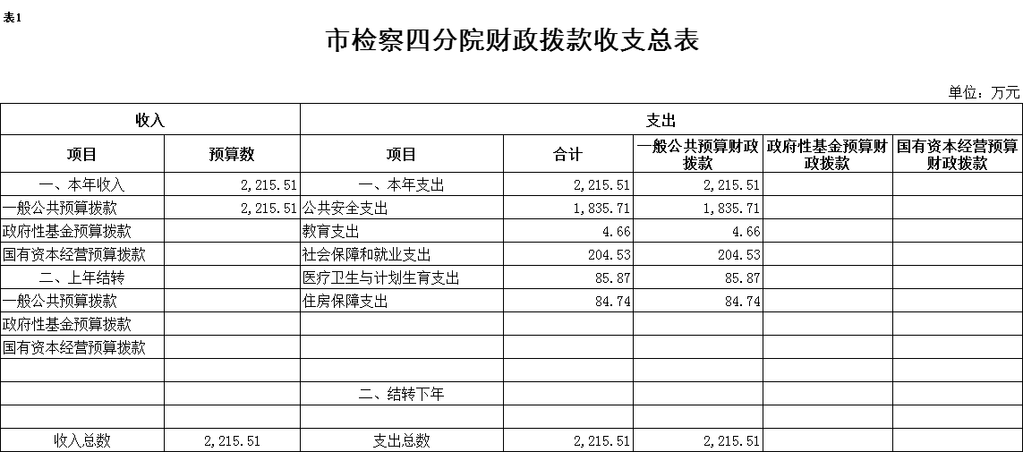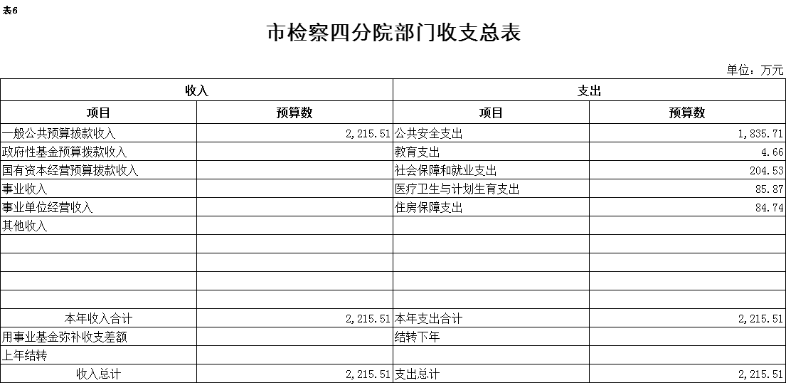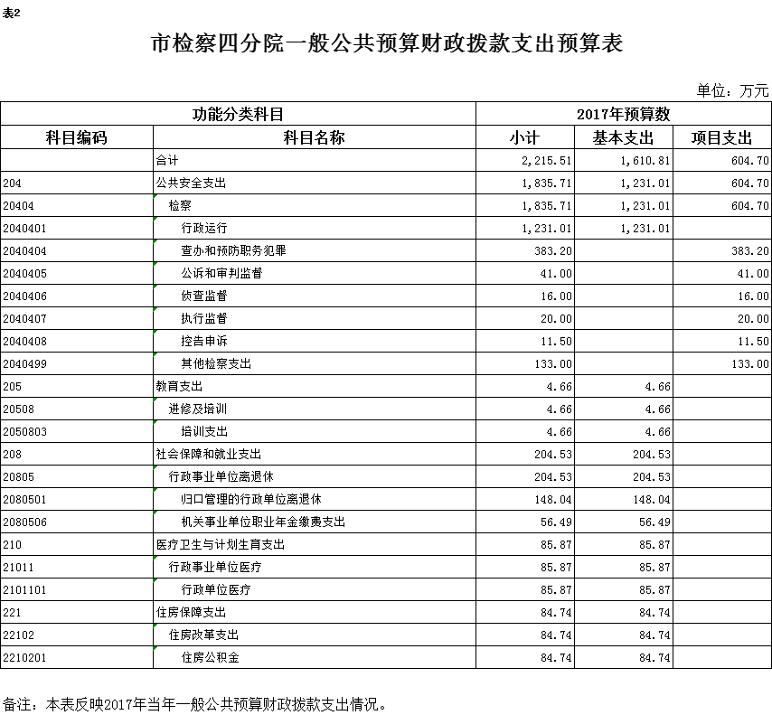 2017年一般公共预算财政拨款收入2215.51万元,一般公共预算财政拨款支出2215.51万元,比2016年增加93.75万元。其中:基本支出1610.81万元,比2016年增加212.05万元,主要原因是人员工资、津贴提标,新增机关事业单位职业年金缴费支出等,主要用于保障在职人员工资福利及社会保险缴费、离退休人员离退休费及生活补助,保障部门正常运转的各项商品服务支出;项目支出604.7万元,比2016年减少118.3万元,主要原因是减少了2016年一次性支出因素。主要用于查办和预防职务犯罪、公诉和审判监督、侦查监督、执行监督、控告申诉等重点工作。