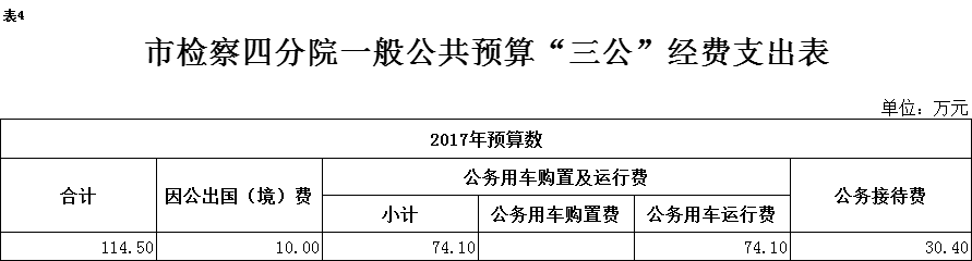 2017年“三公”经费预算114.5万元,与上年持平。其中:因公出国(境)费用10万元,与上年持平;公务接待费30.4万元,比2016年减少7.6万元;公务用车运行维护费74.1万元,比2016年增加7.6万元;公务用车购置费0万元,与上年持平。主要原因是我单位严格执行八项规定,压缩公务接待规模和次数,公务接待支出逐年下降;同时,由于2016年我单位办理的大要案增多,预计2017年公务用车运行维护费会随着办案出差次数增多略有增加。