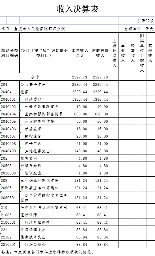本部门2016年度财政拨款收入2,527.73万元,较上年决算数减少21.04万元,下降0.83%,主要原因是财政指标调整。较年初预算数增加405.97万元,增长19.13%。主要原因是增人增资、津贴提标、办理大要案等。